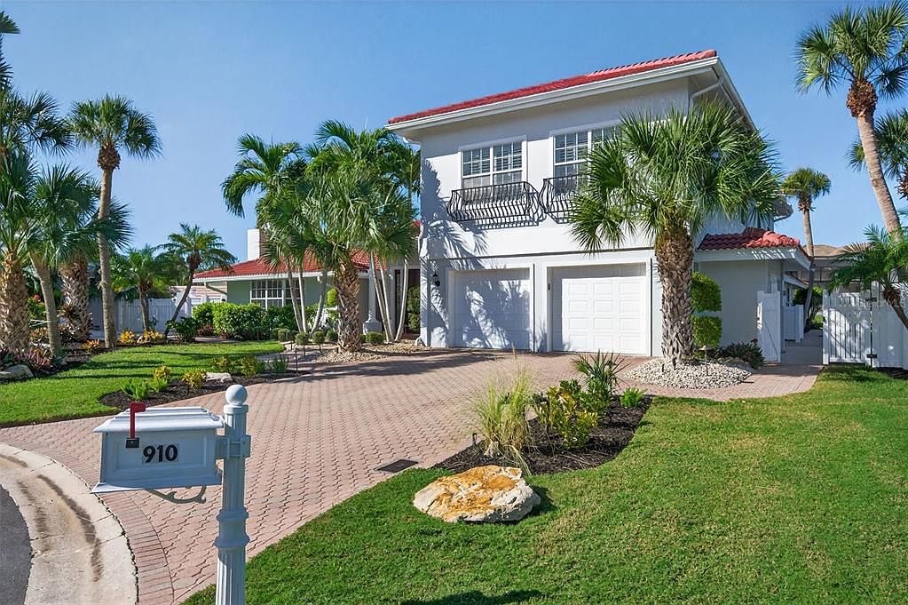 A welcoming exterior showcases a two-story house with a vibrant red-tiled roof and white walls, reflecting a classic coastal aesthetic. The front is surrounded by lush palm trees and well-maintained tropical landscaping, enhancing curb appeal. A brick-paved driveway supports two garage doors, blending function with style. Above, a charming balcony features decorative wrought iron railings, providing character and outdoor space. The healthy green lawn is interspersed with decorative stones and colorful flower beds, creating an inviting atmosphere. A mailbox stands at the curb, completing this idyllic scene and emphasizing a sense of home.