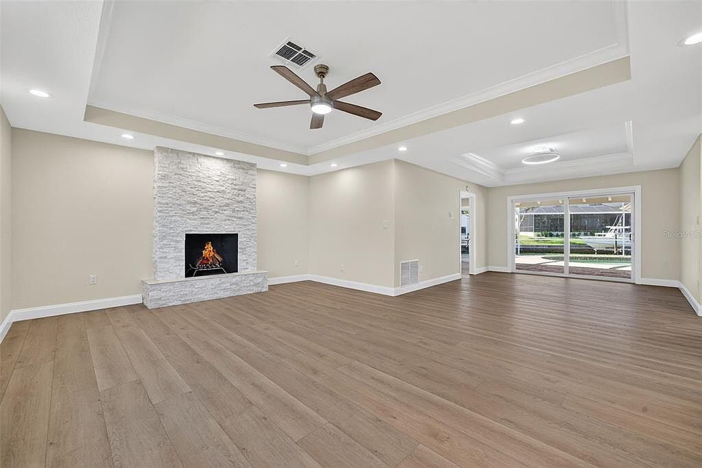 This spacious living room features a modern design with a stylish stone fireplace as a focal point. The light beige walls complement the warm brown wood-like flooring, creating an inviting ambience. A sleek ceiling fan with wooden blades adds a touch of elegance, while recessed lighting provides bright illumination. Large sliding glass doors allow ample natural light and offer views of the outdoor space, enhancing openness. The minimalist decor emphasizes a clean look, making it a perfect canvas for furnishing. Architectural details, such as the coffered ceiling, further elevate the room’s aesthetic appeal.