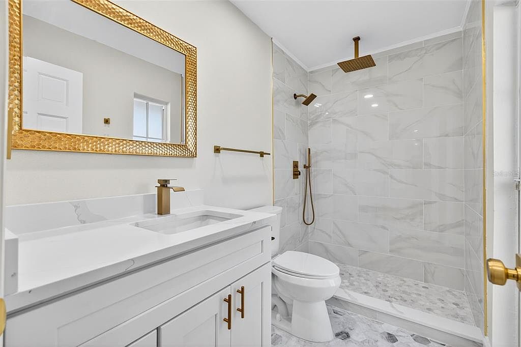 This modern bathroom features a sleek layout with a minimalist design. The walls are adorned with large, white marble tiles, providing an elegant sheen, while a contrasting honey gold faucet and showerhead add a touch of luxury. A white vanity with polished surfaces complements the space, accented by a chic mirror framed in ornate gold. The flooring showcases a delicate mosaic pattern, harmonizing with the overall aesthetic. Ample lighting brightens the room, creating an airy feel. The combination of soft neutrals and metallic elements enhances the contemporary vibe, making the space both functional and visually appealing.