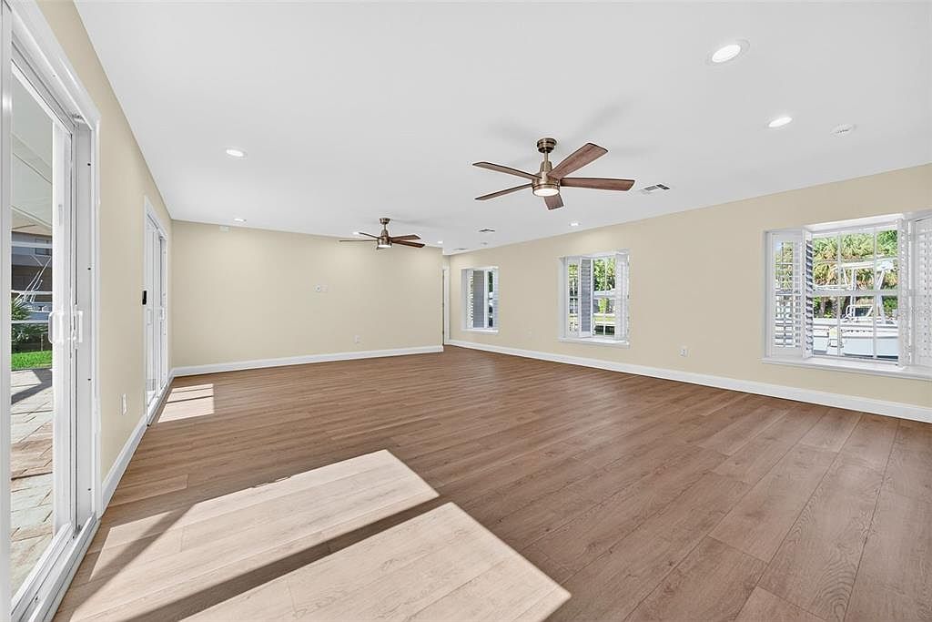 This spacious living room features a light, neutral color palette of soft yellow walls complemented by light brown laminate flooring, enhancing the room’s brightness. Multiple windows allow for abundant natural light, with plantation shutters adding a touch of elegance. A modern ceiling fan hangs gracefully from the ceiling, contributing to airflow and comfort. The layout is open, providing ample space for furniture arrangements, ideal for both relaxation and entertainment. The unobstructed views of the outdoors create a serene atmosphere, while the clean lines and simplicity of the design elements promote a contemporary, inviting environment.