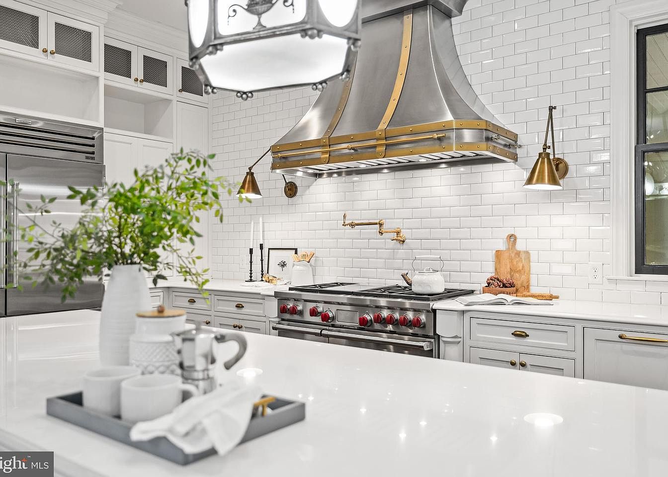 This modern kitchen features sleek stainless steel appliances, including a professional-grade range with bold red knobs. An elegant range hood in brushed metal accentuates the space, paired with brass light fixtures for a warm glow. The backsplash is adorned with white subway tiles, creating a clean backdrop. A large island with a glossy white countertop serves as a centerpiece, hosting tasteful dishware and greenery in a simple vase. Cabinets are characterized by a light gray finish with polished brass hardware, offering both style and functionality. Natural light streams in through a nearby window, enhancing the fresh, inviting atmosphere.