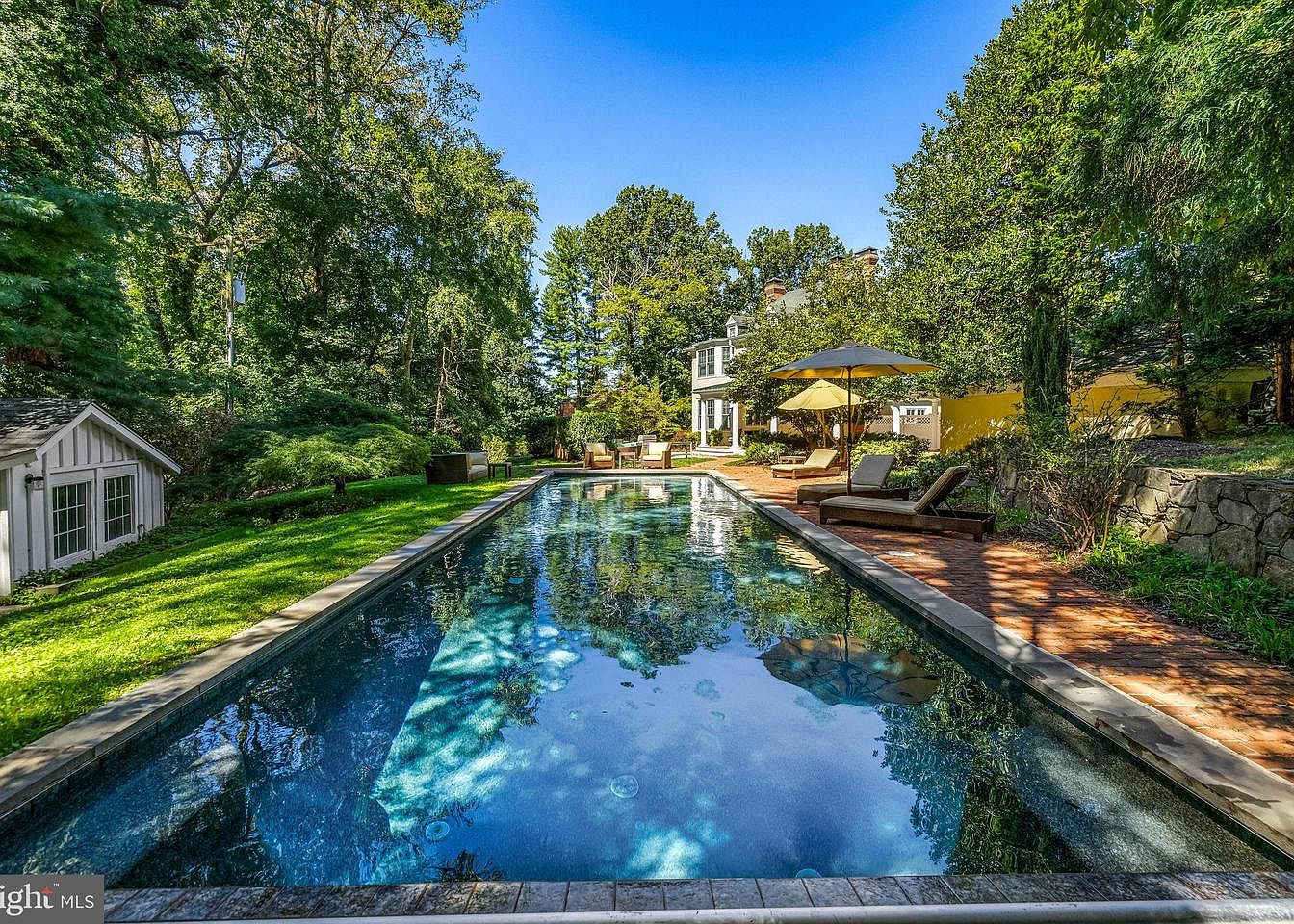 A serene backyard retreat centers around a shimmering swimming pool, flanked by lush greens and mature trees. The pool, framed by a stone coping, reflects the vibrant blue sky, creating an inviting atmosphere. Light brown wooden loungers, accented by yellow umbrellas, provide relaxing spots for sunbathing. A rustic stone wall sets a charming backdrop, complementing the well-manicured lawn that transitions smoothly into a paved area. Soft sunlight filters through the foliage, enhancing the natural beauty of the environment, while the distant house boasts elegant architecture, adding sophistication to this tranquil and refreshing outdoor space.