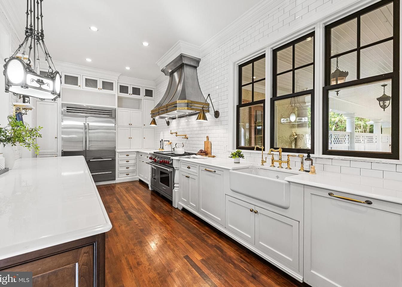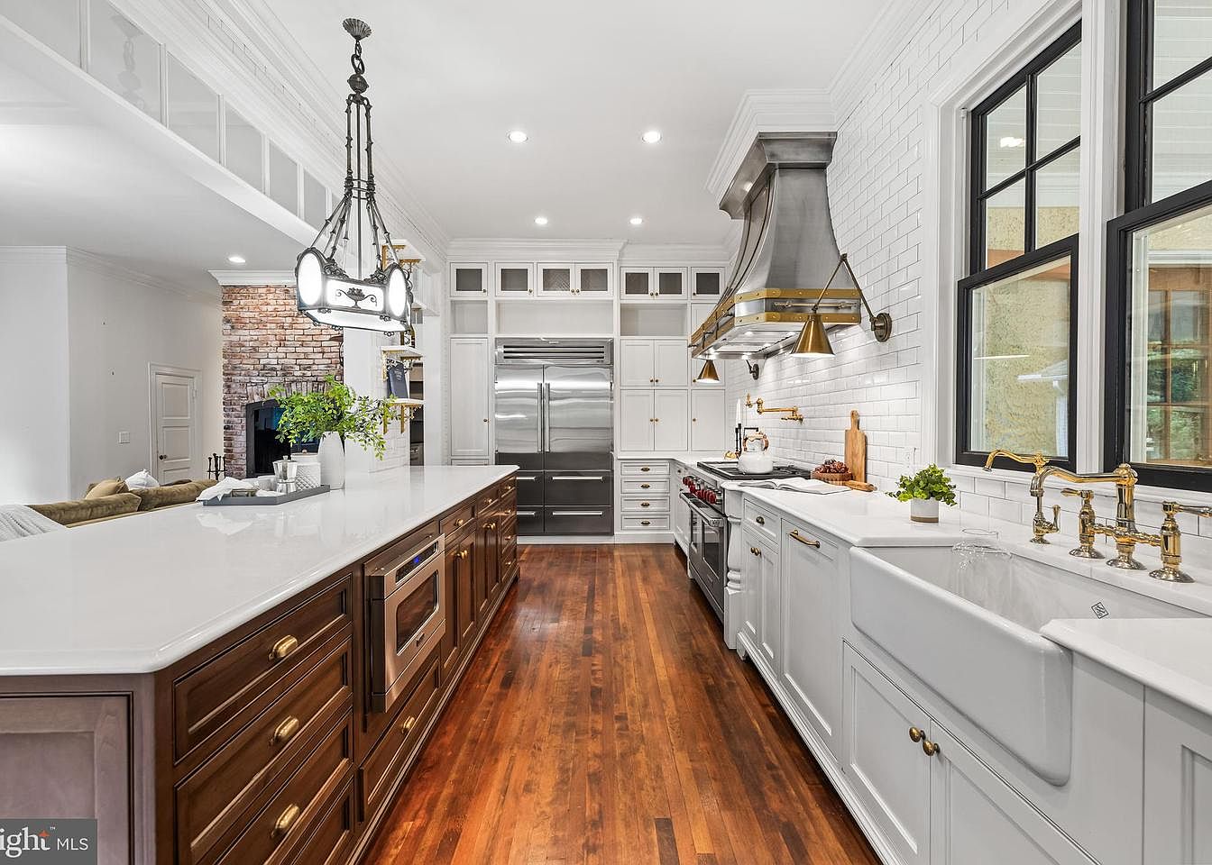 A modern kitchen showcasing a sleek design accentuated by a blend of white cabinetry and warm natural wood tones. The long island features a polished white countertop and draws attention with its rich wood base. Stylish pendant lights hang above, highlighting the workspace. The backsplash consists of clean white subway tiles, creating a fresh backdrop against the stainless steel appliances, including a professional-grade gas range and a double-door refrigerator. Brass fixtures add an elegant touch, complemented by a farmhouse sink. Large windows allow ample natural light, enhancing the airy feel, promoting a vibrant cooking environment.