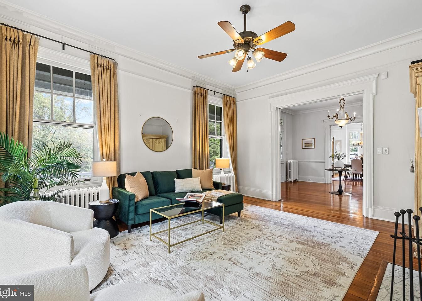 This spacious living room features a rich green velvet sofa adorned with neutral pillows, inviting relaxation. A golden coffee table contrasts beautifully with the plush area rug, marked by an intricate pattern. Tall, elegant curtains in warm gold drape around expansive windows, allowing natural light to filter in, while a circular mirror reflects the soft glow from nearby lamps. The polished hardwood floors add warmth, leading toward an adjacent dining area, where a classic chandelier hangs, enhancing the room’s vintage charm. A potted plant adds a touch of greenery, creating a welcoming atmosphere ideal for gatherings.
