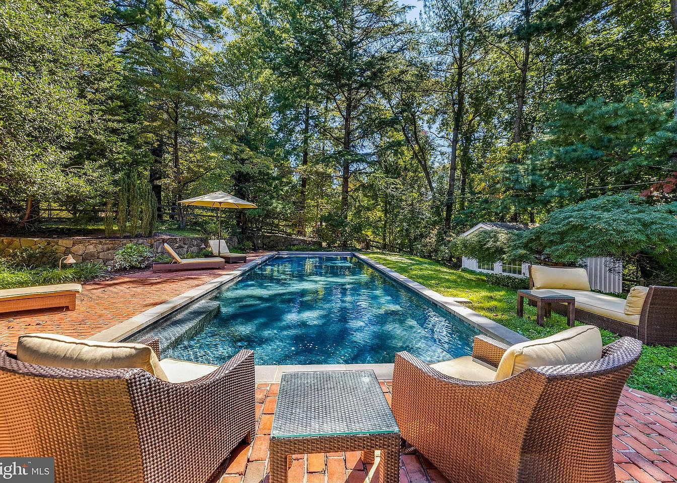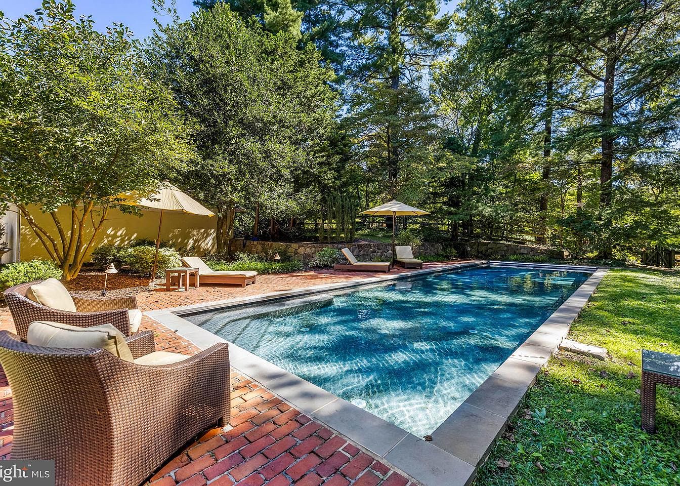 A serene swimming pool area featuring a sleek rectangular pool bordered by smooth stone tiles. Surrounding the pool, rich red brick pavers create an inviting pathway, contrasting beautifully with the lush green grass and trees that encompass the space. Comfortable wicker seating, adorned with soft beige cushions, offers relaxation spots perfect for enjoying the sun. An elegant umbrella provides shade for those seeking relief from the sunlight. The backdrop of tall trees adds a natural, tranquil atmosphere, enhancing the outdoor aesthetic. This setting seamlessly blends relaxation and nature, ideal for recreation and leisure.