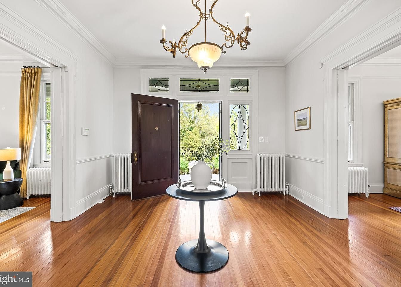 The entryway showcases a blend of elegance and functionality. Polished hardwood flooring adds warmth, complemented by white walls and intricate crown molding. A striking brass chandelier hangs from the ceiling, illuminating the space. To one side, a large dark wooden door opens to the outdoors, revealing a view of greenery through decorative glass panels. A sleek round table with a black base sits centrally, adorned with a simple white vase. Radiators line the walls, harmonizing with the traditional aesthetic. Soft yellow drapes frame the windows, enhancing the inviting atmosphere while adding a touch of color.