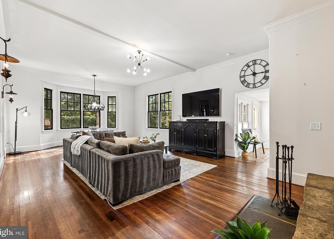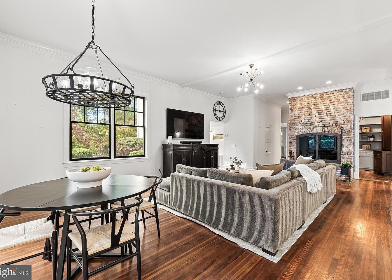 A warm and inviting living room showcases a blend of modern and traditional aesthetics. Rich hardwood flooring complements a plush, textured sectional sofa in muted tones, adorned with decorative pillows. A circular black dining table surrounded by stylish chairs offers a casual dining space. An elegant, wrought-iron chandelier hangs above, illuminating the area. A striking stone fireplace serves as a focal point, flanked by a sleek entertainment unit featuring a flat-screen TV. Large windows invite natural light, framed by minimalistic black accents, while a clock and decorative plants enhance the overall atmosphere, creating a cozy yet sophisticated ambiance.