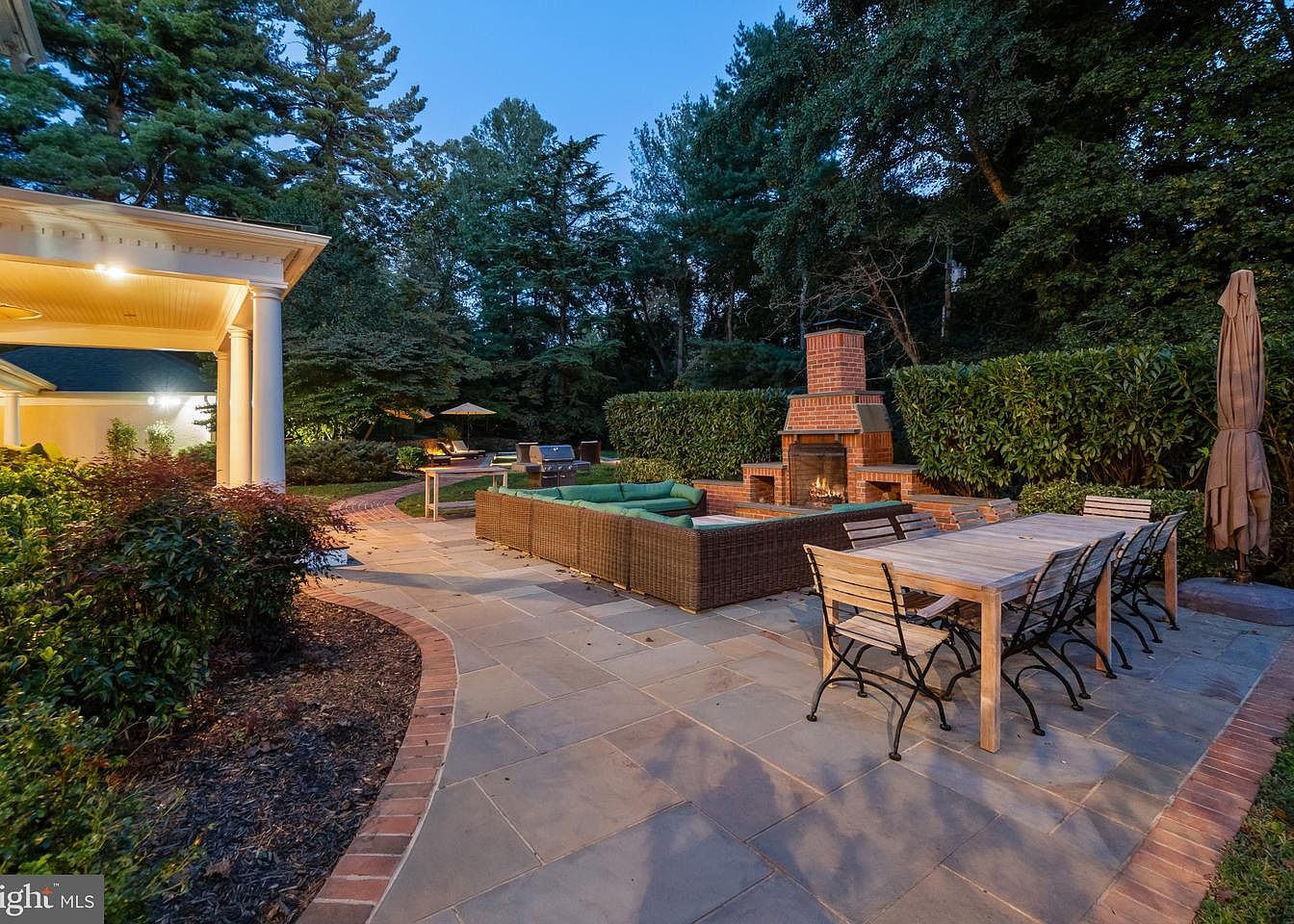 An inviting outdoor patio features a warm, rustic aesthetic. The space includes cozy lounge seating with plush green cushions, arranged around a modern fire pit, ideal for gatherings. A long wooden dining table with sleek metal chairs sits nearby, enhancing the communal feel. The patio is paved with light-toned stones, contrasting against the surrounding lush greenery and closely trimmed hedges. A charming brick outdoor fireplace stands prominently, providing warmth and ambiance. The scene is delicately illuminated, suggesting evening use, while hints of nature against the blue twilight sky create a tranquil atmosphere for relaxation.