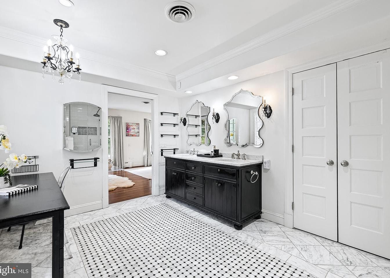 This spacious bathroom features a sophisticated design with a sleek black double vanity topped with white marble, enhancing its elegance. The room showcases polished marble flooring adorned with classic black and white hexagonal tiles, offering a timeless aesthetic. Two ornate mirrors are accentuated by chic sconces, adding a light touch to the overall decor. A modern chandelier hangs from the ceiling, providing ambient lighting. Adjacent, a doorway leads to another room, partially visible and dressed with soft curtains. Decorative shelving units on the walls add functional decor, balancing functionality with style in this refined sanctuary.