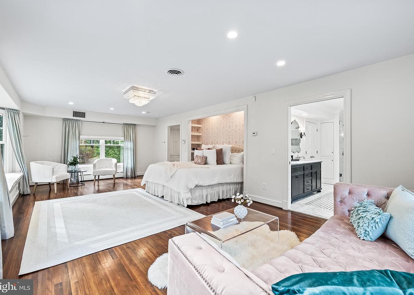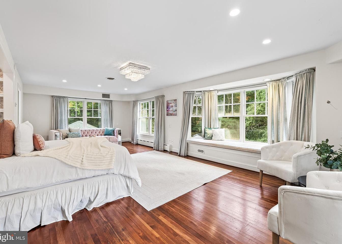 This serene bedroom features a blend of modern and classic aesthetics. A light beige and white color scheme creates a tranquil atmosphere, complemented by plush bedding draping over a bed with a ruffled skirt. The hardwood floor adds warmth, while the large windows invite natural light, showcasing lush greenery outside. Chic gray curtains frame the windows, enhancing the room’s elegance. A tufted pink sofa, adorned with colorful cushions, provides additional seating, while a soft area rug offers comfort underfoot. A crystal chandelier and simple yet modern décor elements further elevate the sophistication of this inviting space.