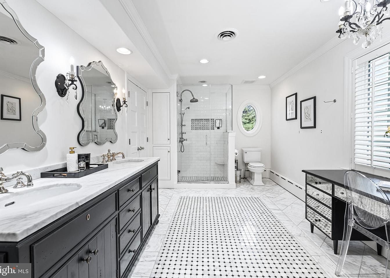 The bathroom features a sophisticated layout with a blend of modern and classic elements. A sleek dark vanity with white marble countertops holds dual sinks, adorned with polished chrome fixtures. Above, three elegantly shaped mirrors complement stylish sconces that provide warm lighting. The shower, enclosed with glass panels, showcases white subway tiles with a decorative accent. Flooring boasts a black and white hexagonal pattern, enhancing the space’s charm. A rounded window allows natural light to illuminate the room, while minimalist artwork graces the walls. A chic black dressing table paired with a transparent chair adds contemporary flair.