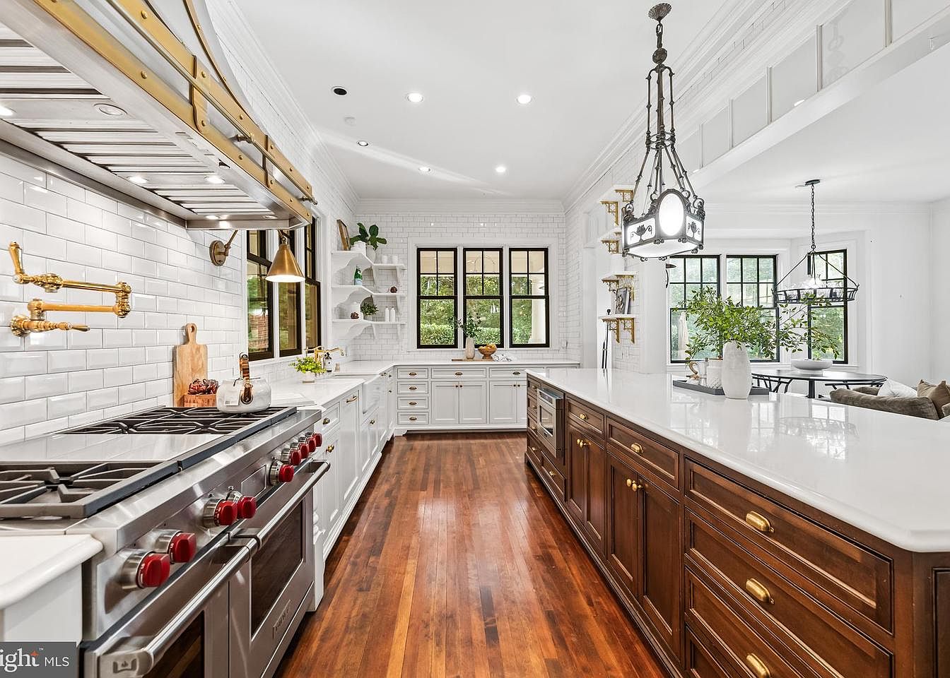 This modern kitchen features an open layout with a blend of white cabinetry and rich wooden accents. The walls are covered in glossy white subway tiles, enhancing brightness. A large island, with a smooth white countertop, provides ample workspace and includes deep brown cabinetry below. High-end stainless steel appliances, including a professional-grade stove with red knobs, add sophistication. Brass fixtures, such as a pendant light and wall-mounted faucet, introduce warmth. Multiple windows allow natural light to flood in, illuminating a small breakfast nook adorned with greenery, creating a welcoming and stylish culinary space.