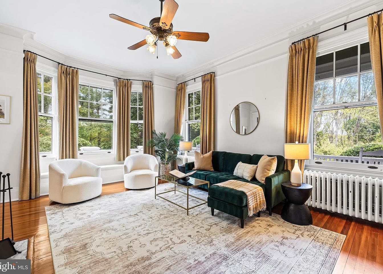 The spacious living room features elegant bay windows, filling the area with natural light. Rich golden drapes frame the windows, conveying warmth. A plush emerald green sectional sofa contrasts beautifully with the soft beige and cream tones of the area rug. Two contemporary white accent chairs flank a glass coffee table, introducing a clean modern touch. Decorative pillows add a cozy feel, while a round mirror on the wall enhances the room’s brightness. Nearby, a stylish floor lamp and a medium wood radiator blend functionality with design, showcasing a harmonious balance of vintage and contemporary aesthetics.