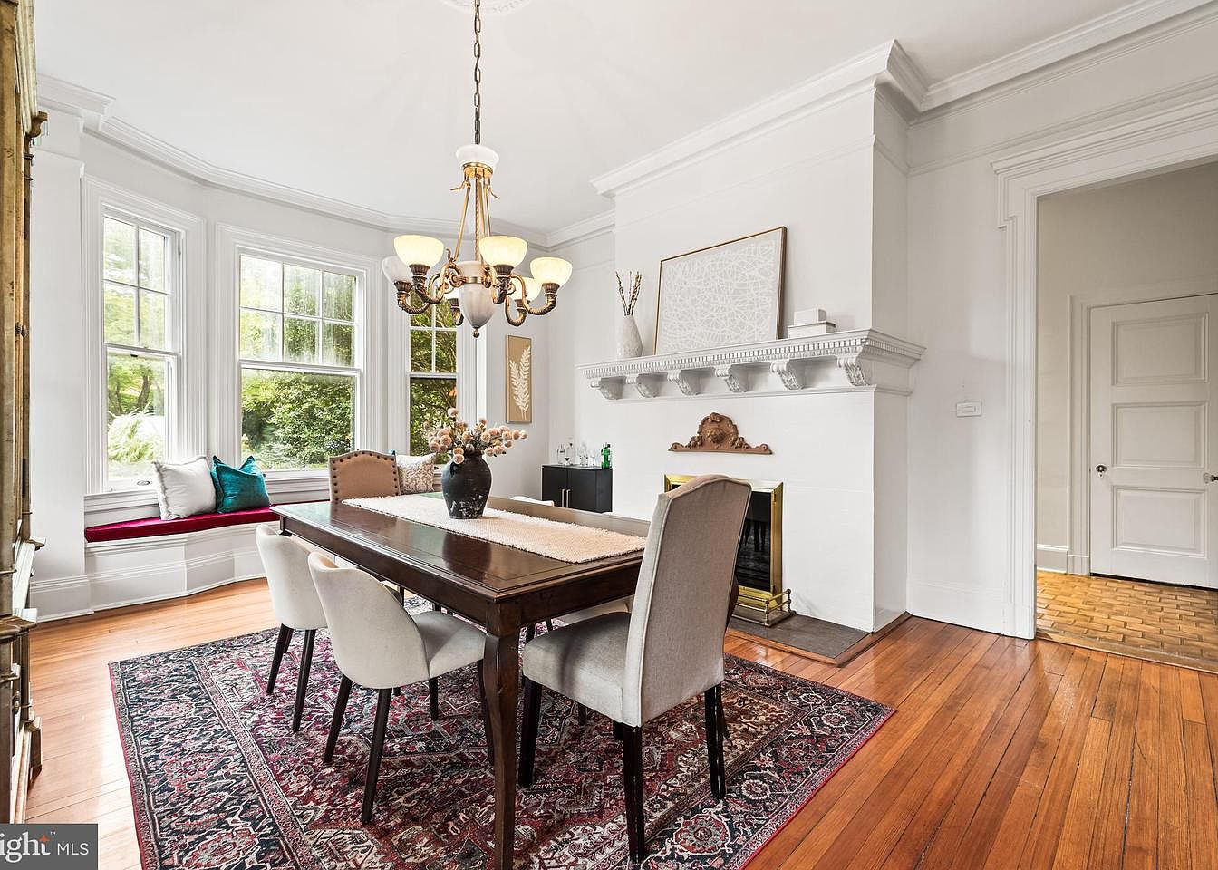 The dining room features a rich wooden dining table, surrounded by upholstered chairs, creating an inviting atmosphere. A prominent chandelier hangs from the ceiling, casting a warm glow. The walls are primarily white, showcasing crown molding and a decorative fireplace with ornate detailing. A plush area rug with intricate patterns adds warmth underfoot, contrasting with the polished hardwood floors. Large bay windows allow natural light to flood the room, enhanced by a cozy window seat adorned with colorful cushions. Adjacent to the fireplace, elegant decor elements create a charming focal point, merging modern and classic aesthetics seamlessly.