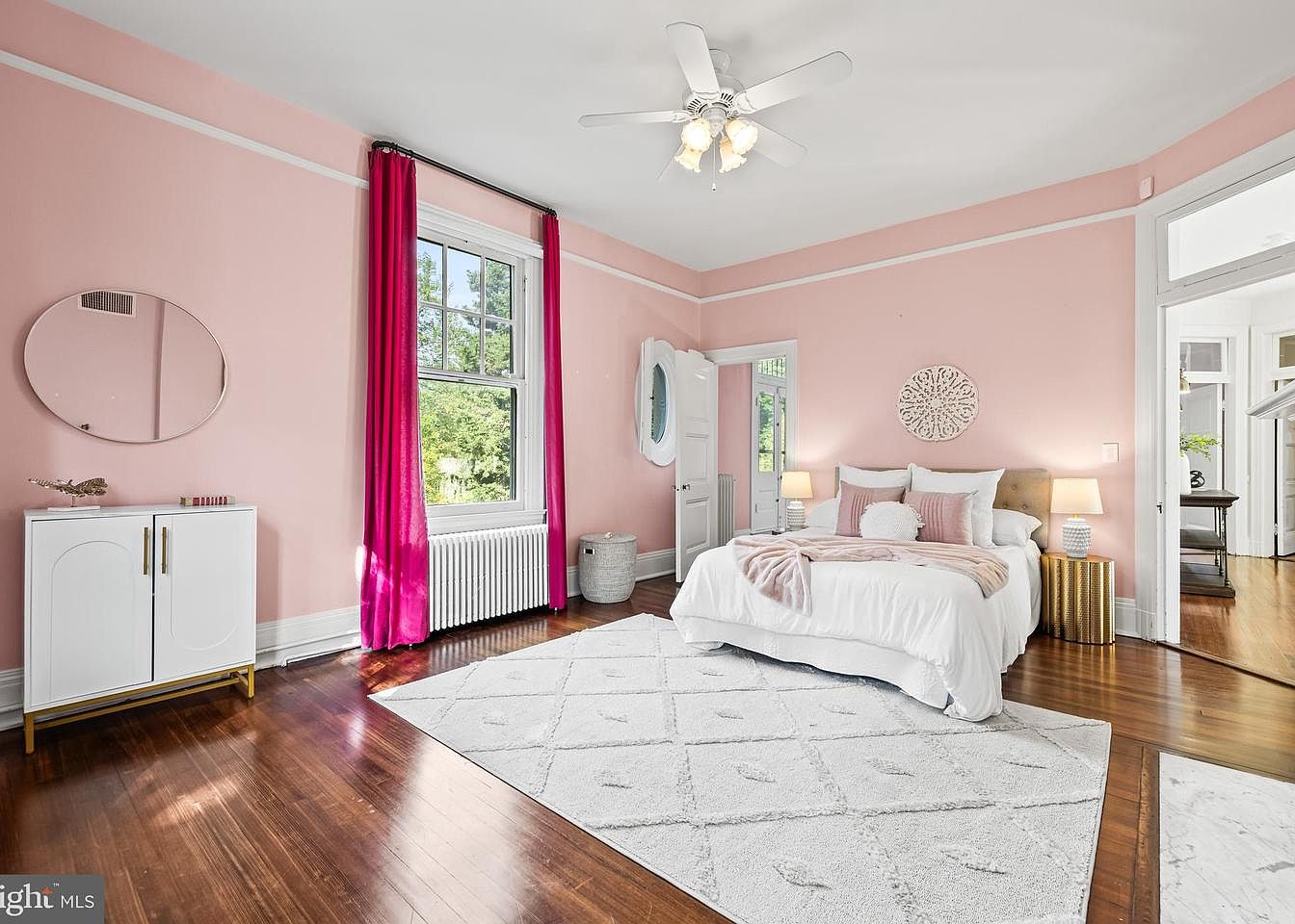 A cozy bedroom featuring soft pink walls that create a warm ambiance. The room includes a plush white bed adorned with pale pink pillows and a blanket. Beside the bed, stylish metallic side tables hold soft lamps, enhancing the lighting. Large windows with vibrant magenta curtains allow natural light, accentuated by white trim. A round mirrored wall decor adds elegance, while the hardwood floor contrasts beautifully with a textured light rug. Across the room, a sleek white cabinet with gold accents provides storage. Architectural elements, such as a ceiling fan and classic doorways, contribute to the historic charm of the space.