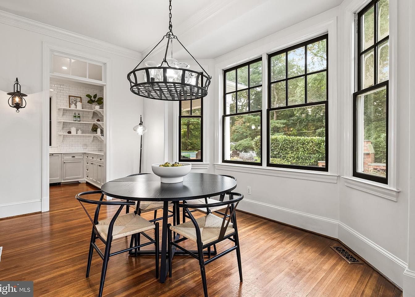 This dining nook features a round, black table surrounded by four elegant chairs with woven seats, creating a cozy yet stylish atmosphere. Large, black-framed windows allow natural light to flood the space, complemented by white walls and rich hardwood flooring that enhances warmth. A distinctive black metal chandelier hangs above the table, adding a touch of modern elegance. To the left, an open space reveals a well-appointed kitchen with light cabinetry and exposed shelving displaying neatly arranged decor and kitchenware, creating a seamless transition between dining and cooking areas. The overall design feels timeless and inviting.