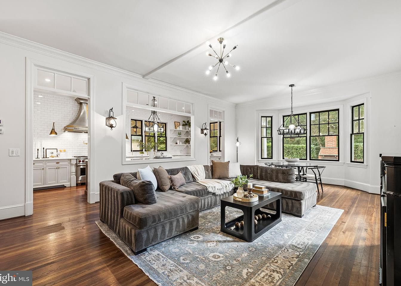 A cozy living room featuring a spacious sectional sofa in muted gray, adorned with cream and light blue cushions. The warm brown hardwood floor contrasts elegantly with a soft area rug showcasing intricate patterns in muted tones. A contemporary coffee table, with rounded edges and a black frame, sits at the center, decorated with potted plants and books. Large, well-lit windows framed in black offer views of the garden, enhancing natural light. The room includes stylish light fixtures, blending modern decor with elements of traditional charm, creating an inviting atmosphere perfect for relaxation.
