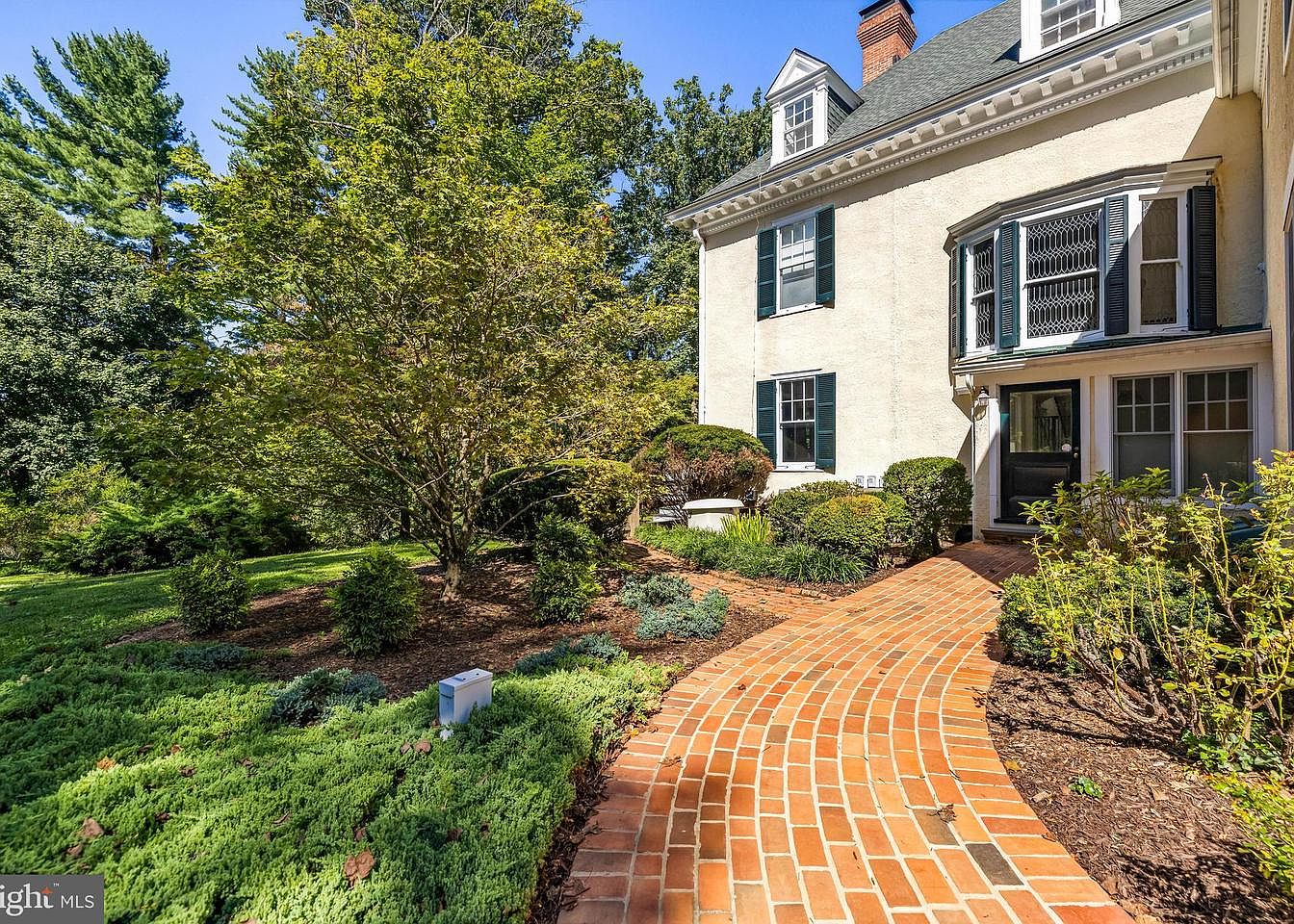 A charming brick pathway winds toward the entry of a historic American home, framed by lush greenery. The pathway features warm, reddish tones that contrast beautifully with the pale exterior of the house. Flanking the pathway are meticulously arranged bushes and ornamental plants, creating an inviting landscape. The home showcases classic architectural details such as multi-paned windows with dark shutters and a small front porch. A gabled roof adds to the traditional aesthetic, while the surrounding tall trees and verdant lawn enhance the serene atmosphere, making this entry a delightful welcome to the property.