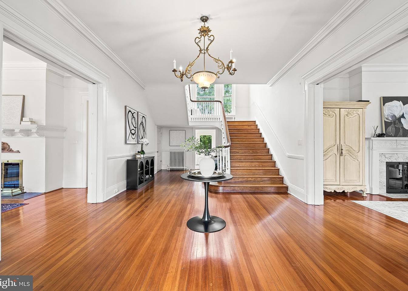 A spacious entryway features polished hardwood flooring that enhances the warm tones of the wood. A stylish chandelier hangs from a high ceiling, providing ample illumination. To the left, a white fireplace with decorative moldings serves as a focal point, complemented by minimalist artwork on the walls. A circular black table in the center holds a white vase with greenery, adding a touch of nature. A grand staircase with wooden steps ascends in the background, framed by white railings that exude elegance. Black furniture accents contrast beautifully against the light color palette of the walls.