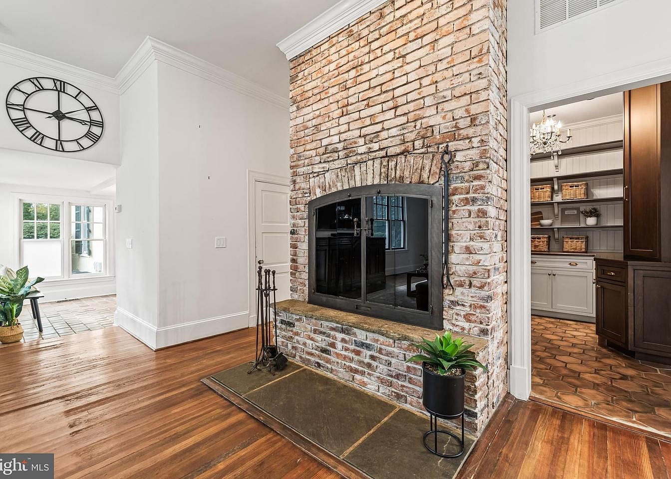 A striking brick fireplace serves as the focal point, featuring a rustic texture and a classic arched mantel. Accented by a slate hearth, it complements the warm hardwood flooring, enhancing the room’s inviting atmosphere. To the side, an entry leads to a pantry with rich cabinetry and neatly arranged shelves, adding functionality. The space is brightened by natural light from large windows adorned with shutters, creating a cozy yet airy feel. A round wall clock adds a contemporary touch above the fireplace, harmonizing with the timeless elegance of this historic living area.