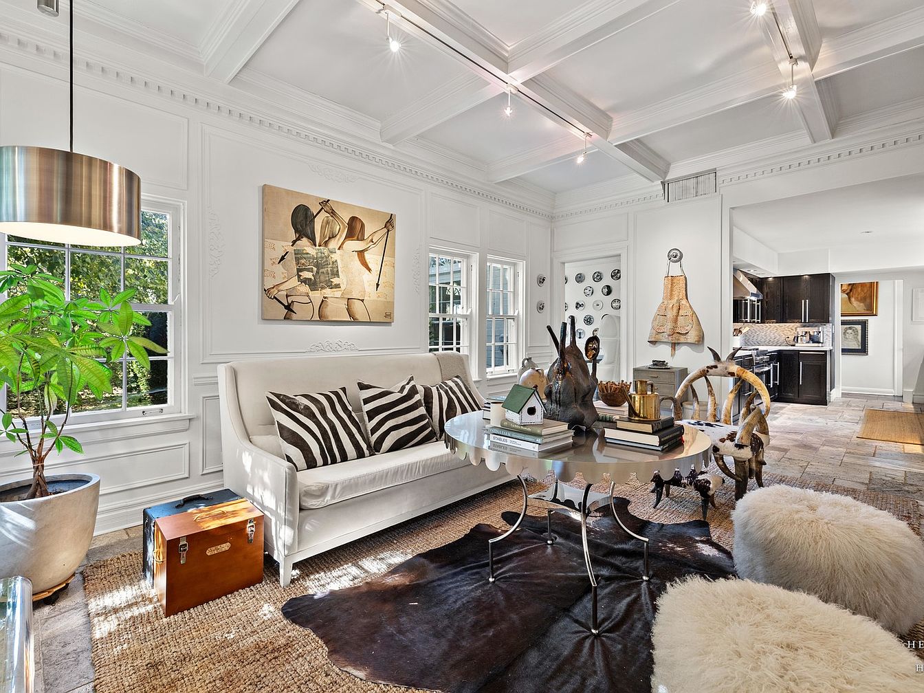 This elegant living room features a bright, airy atmosphere with white walls and intricate moldings. A chic white sofa adorned with zebra-striped cushions complements the polished look. Natural light streams through large windows, highlighting a stylish mix of textures and materials. A circular, reflective coffee table sits atop a cowhide rug, surrounded by fluffy, upholstered stools. Architectural beams grace the ceiling, adding character. A contemporary art piece introduces a blend of color and variety, while a green plant adds a fresh touch. Dark cabinetry and art pieces in the adjoining kitchen complete the inviting and harmonious design.