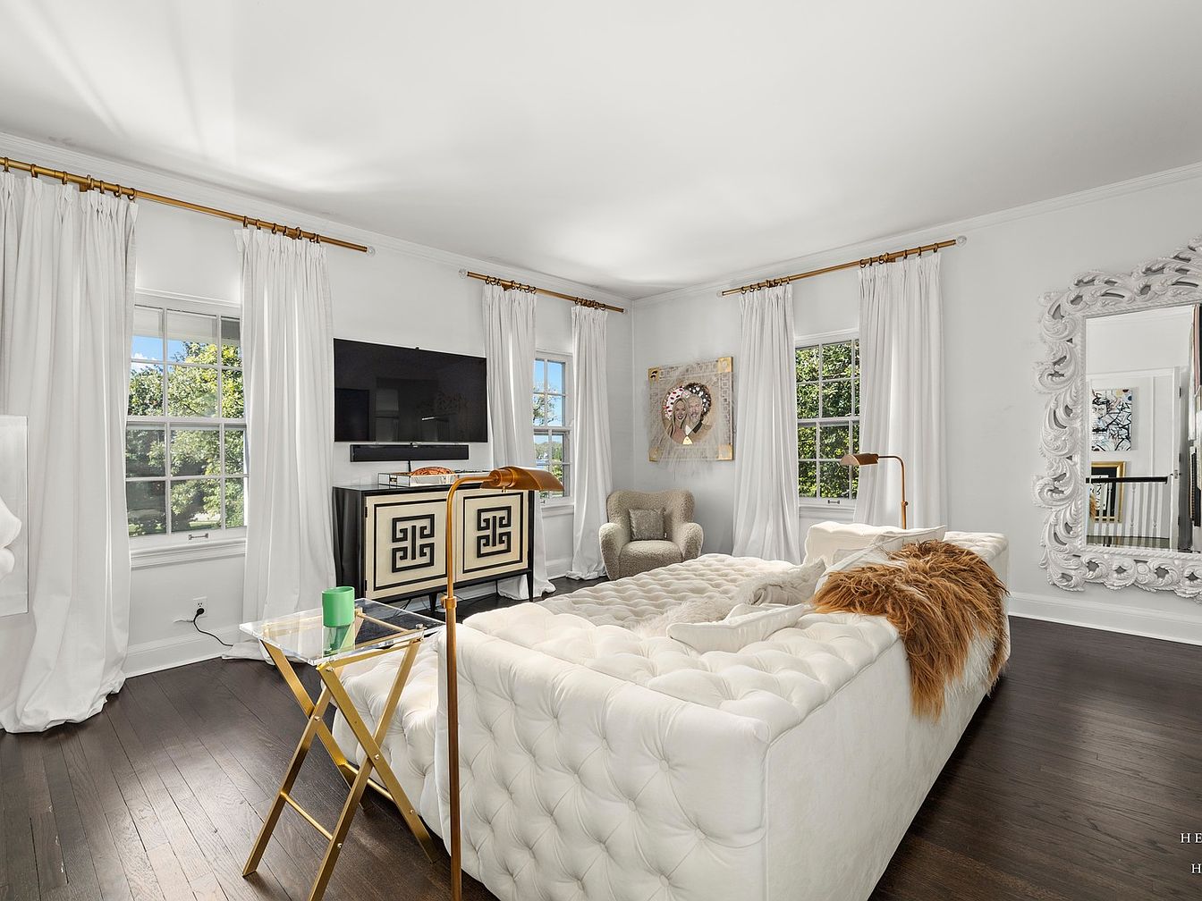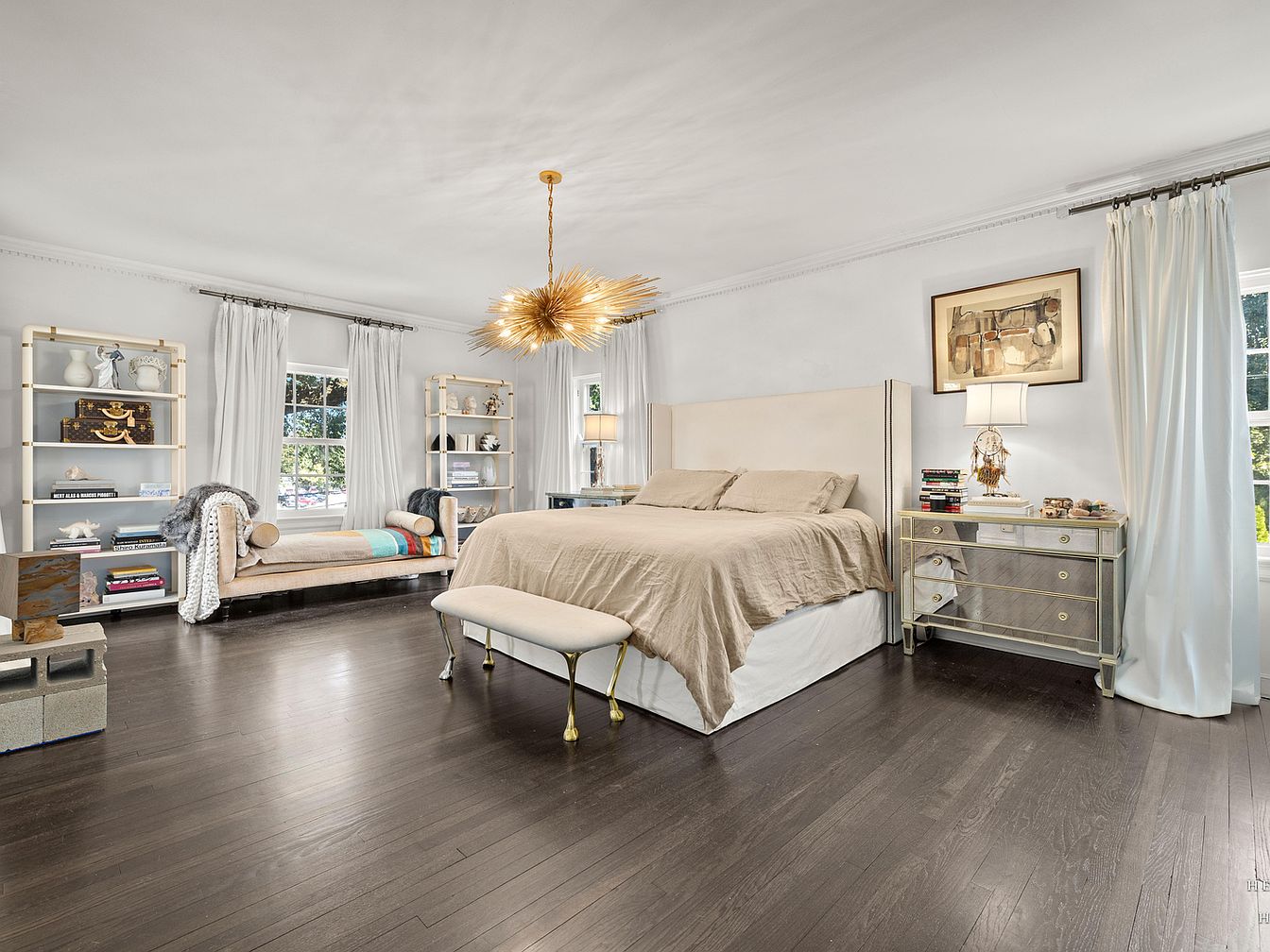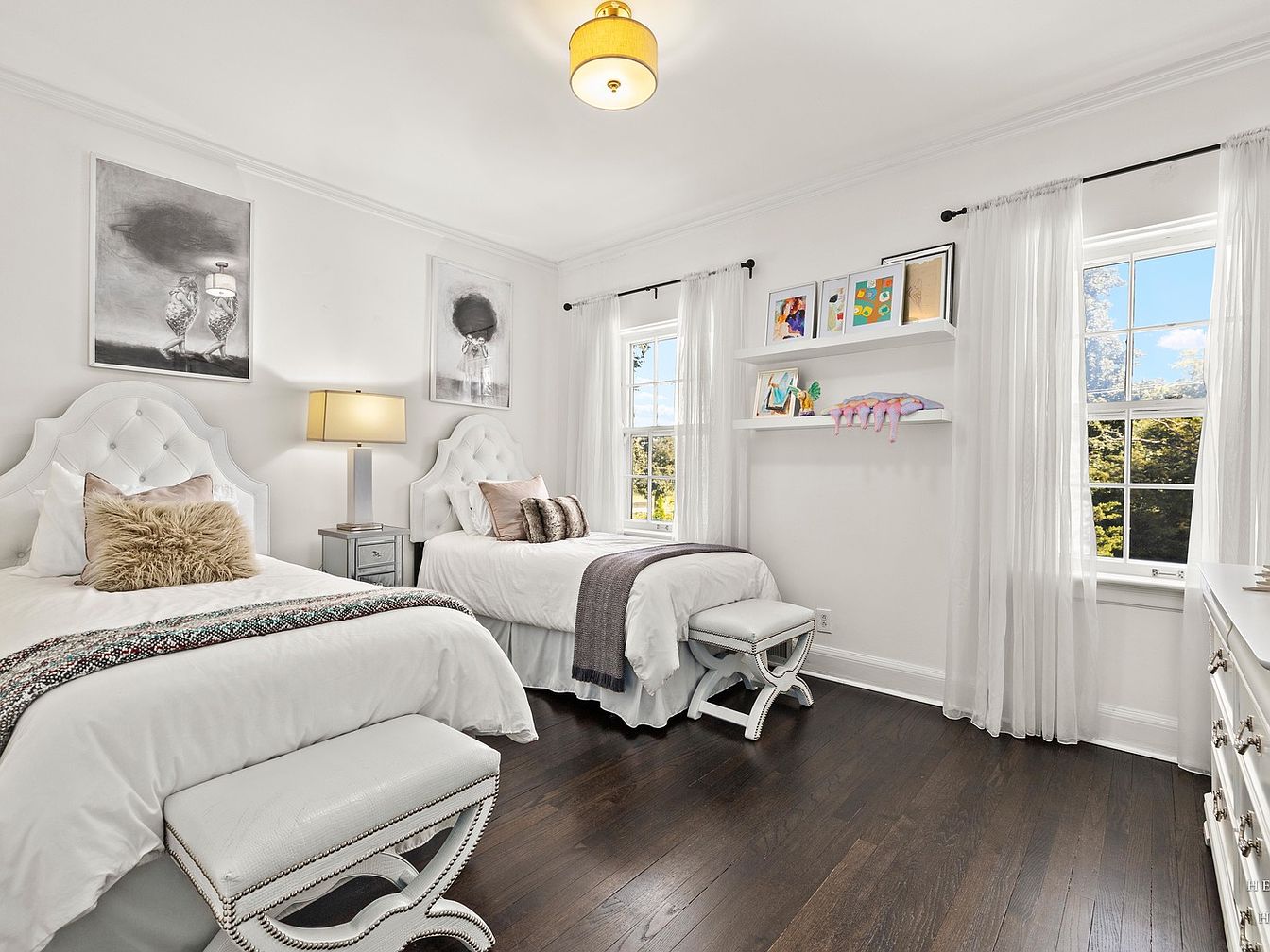 This spacious bedroom showcases a contemporary blend of comfort and elegance. A plush beige bed with an upholstered headboard sits centrally, accented by soft linen bedding. Opposite, a stylish mirrored dresser complements a modern pendant light fixture that adds a warm glow. Shelving units frame the windows, displaying books and decorative items, while a cozy, light-colored chaise lounge offers a sitting area. The floor is finished with dark hardwood, creating a striking contrast with the bright walls and flowing white curtains. Architectural details include crown molding, enhancing the sophisticated ambiance of the room.