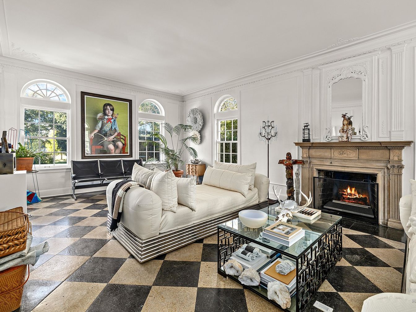 This lavish living room features a striking checkerboard floor of black and beige tiles, enhancing the sense of space. A grand, ornate fireplace serves as the focal point, adorned with intricate molding, while a large, colorful portrait hangs prominently above the mantel. The room is filled with natural light streaming through large arched windows, complemented by elegant, contemporary furniture. A plush white sectional couch invites relaxation, paired with a glass coffee table displaying art books and decorative elements. Lush greenery adds life, and subtle accents like the chandelier and wall decor merge classic and modern aesthetics harmoniously.