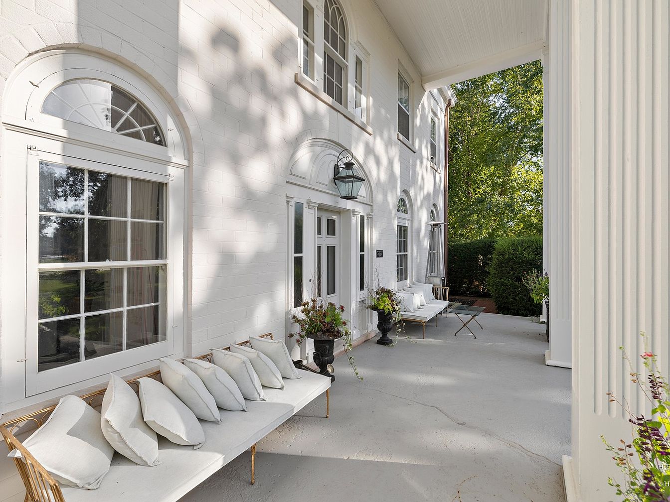 The front porch features grand white columns that support a deep overhang, creating a gracious entrance. The flooring is a smooth concrete, complemented by lush greenery and vibrant flower planters at each side, adding a pop of color. A cozy seating area with white cushioned chairs invites relaxation, surrounded by neatly trimmed hedges that enhance the aesthetic appeal. The backdrop reveals an expansive yard with trees and manicured grass, illuminated by bright, clear skies, creating a serene atmosphere. Architectural details include elegant lighting fixtures mounted on the walls, contributing to the historic charm of the home.