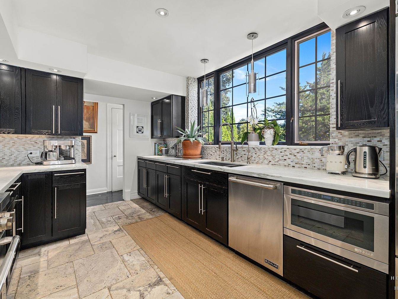 A modern kitchen space featuring sleek, dark cabinetry that contrasts beautifully with the light, textured countertop. The arrangement includes stainless steel appliances, seamlessly integrated for a contemporary look. Large windows flood the area with natural light, enhancing the airy feel and showcasing verdant views outside. A mosaic backsplash adds a subtle pattern, harmonizing with the earthy tones of the flooring. A jute rug lays underfoot, providing warmth and texture, while strategically placed potted plants bring a touch of nature into the space. The overall aesthetic combines elegance and functionality, perfect for culinary creativity.