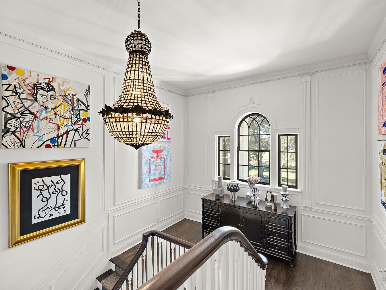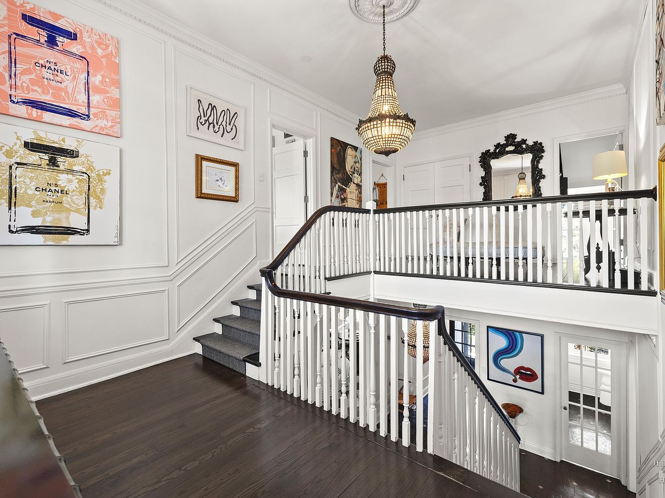 This entryway features an elegant, sweeping staircase leading to a second level, framed by white wainscoting that adds a classic touch. The dark hardwood floors contrast beautifully with the bright white walls, enhancing a feeling of spaciousness. Colorful artwork, including two Chanel bottle prints and an abstract piece, injects personality and modern flair into the historic setting. A grand chandelier hangs from the ceiling, providing a warm glow. The railing of the staircase is sleek, with white balusters lending a refined look. The space is airy, thanks to large windows that invite natural light.