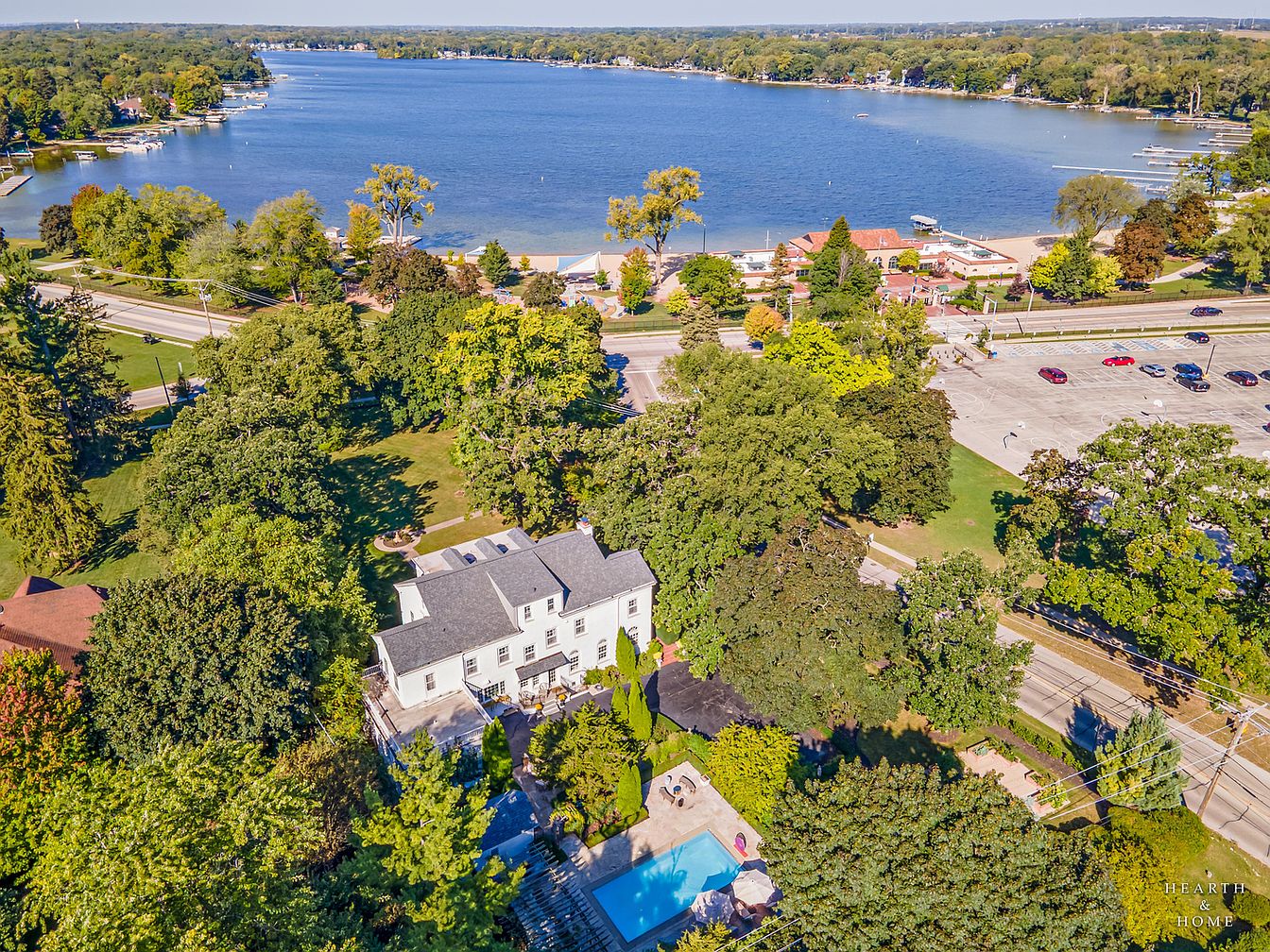 This aerial shot reveals a historic American home surrounded by lush greenery. A large rectangular pool is visible, with lounge chairs positioned around it, inviting relaxation. The house features a classic architectural style with a light-colored facade and symmetrical windows. Dense trees provide privacy and natural beauty, contrasting with the blue water of the adjacent lake. The landscape includes manicured lawns and pathways, enhancing the outdoor living space. Nearby, a beach area with boats and a recreational spot is visible, showcasing a vibrant community atmosphere. The combination of water, trees, and home creates a serene retreat.