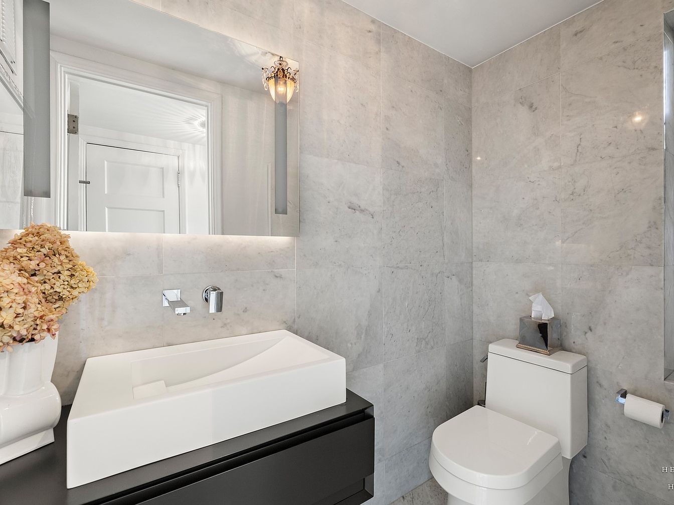 This modern bathroom features sleek design elements with a harmonious blend of materials. The walls are clad in light marble, creating a serene atmosphere, while a stylish floating black vanity complements the neutral tones. A rectangular white basin is positioned prominently, paired with contemporary chrome fixtures. A large mirror with integrated lighting enhances the spacious feel, reflecting the tasteful decor. Delicate dried flowers in a white vase add a touch of softness, contrasting with the polished surfaces. Subtle lighting fixtures add warmth, creating a serene oasis perfect for relaxation and comfort.