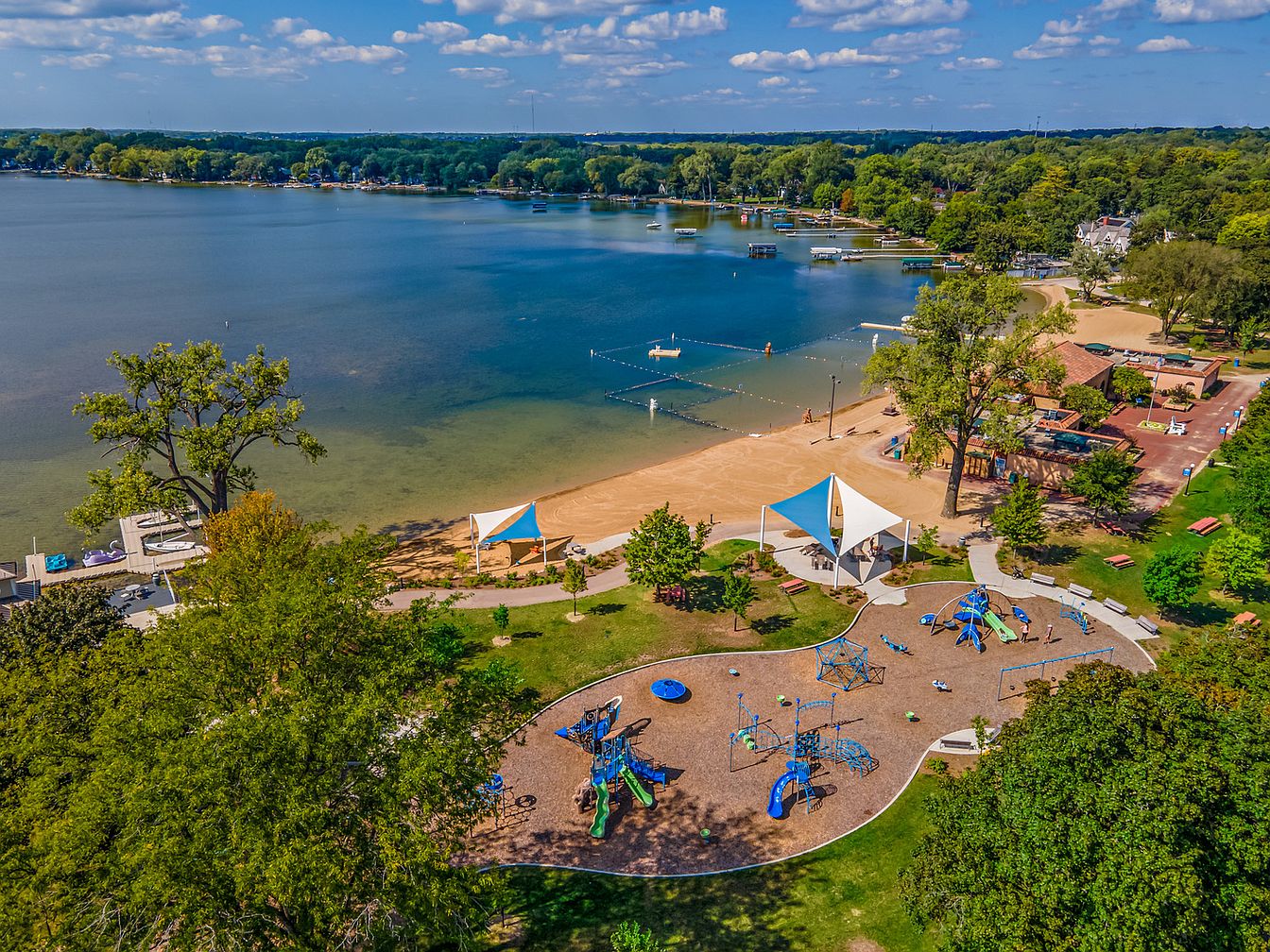 A scenic lakefront park featuring a sandy beach and playground. The children’s play area is vibrant, with playful equipment in blue and green tones, including climbing structures and swings. Surrounding lush trees provide shade, enhancing the outdoor atmosphere. Paved walking paths wind through the park, leading to picnic areas under colorful canopies. In the background, the serene lake reflects a clear sky dotted with fluffy clouds, inviting leisure activities. Families and children can be seen enjoying the space, with boats moored on the lake. Overall, the setting is inviting, combining nature and recreation harmoniously.