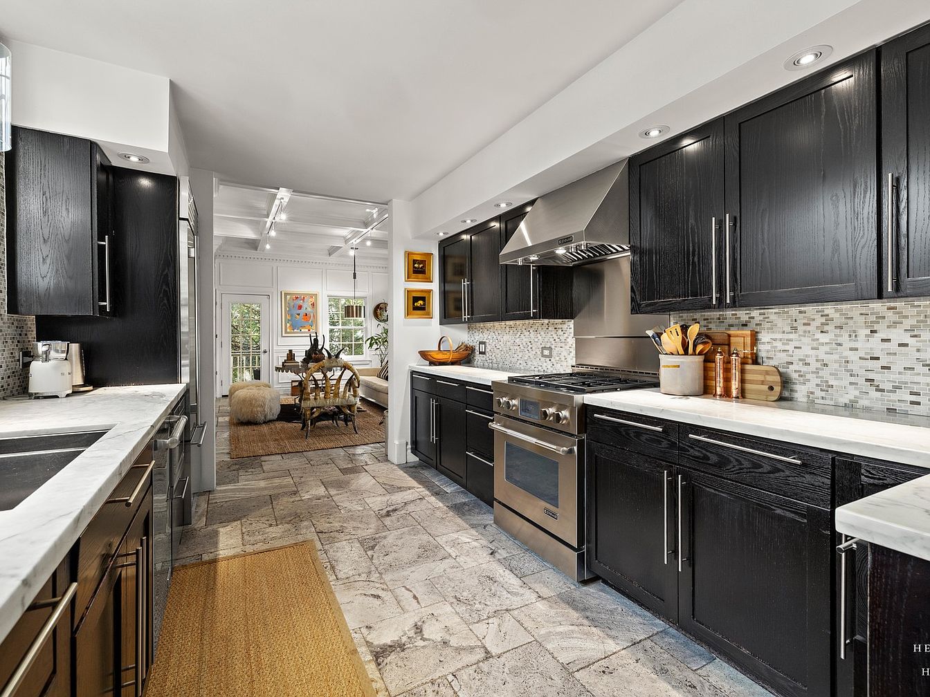 This kitchen features a sleek layout with modern black cabinetry contrasted by a light marble countertop, enhancing its sophisticated aesthetic. The stainless steel appliances, including a large oven and an industrial hood vent, add a contemporary touch. A textured tile backsplash complements the cabinetry, while natural stone flooring creates warmth. The area is illuminated by recessed lighting and natural light streaming in from the adjacent dining area. A woven rug adds comfort underfoot, and cooking essentials are neatly arranged, emphasizing both functionality and style. Open sight lines lead to a cozy living space, tying the areas together.