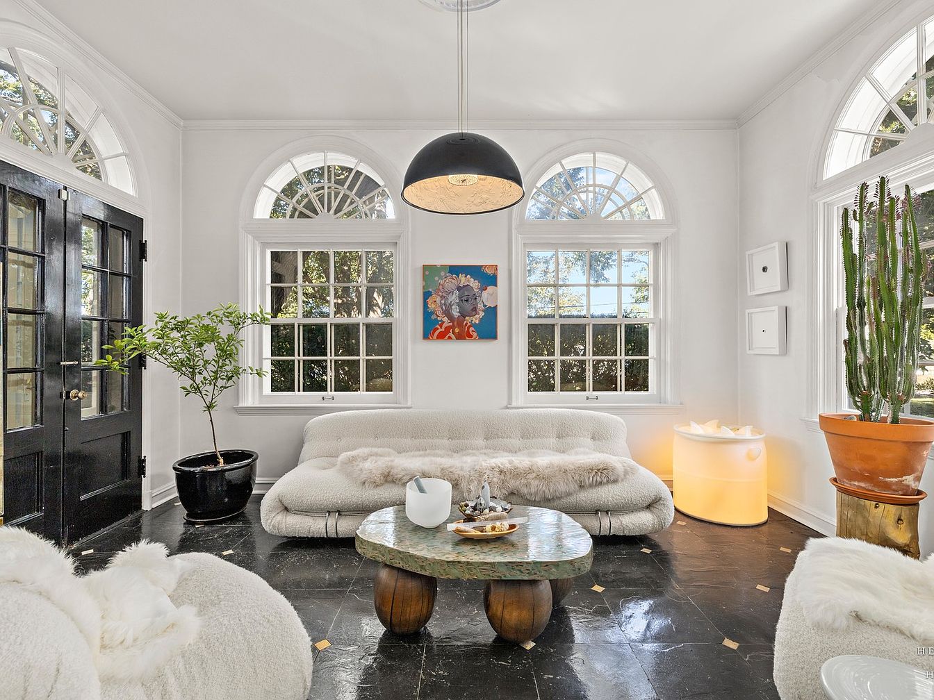 A bright sunroom featuring large arched windows that allow abundant natural light, enhancing the airy atmosphere. The walls are crisp white, contrasting with a dark slate floor embellished with light-colored flecks. A plush, oversized sofa in cream fabric is accented by soft, furry throws. A round coffee table made of green stone and wooden legs adds a natural element. A potted cactus adds greenery, harmonizing with a small tree in a black pot. An artistic wall piece brings color, while a unique, illuminated side table softens the ambiance. A sleek black pendant light hangs overhead, completing the sophisticated look.