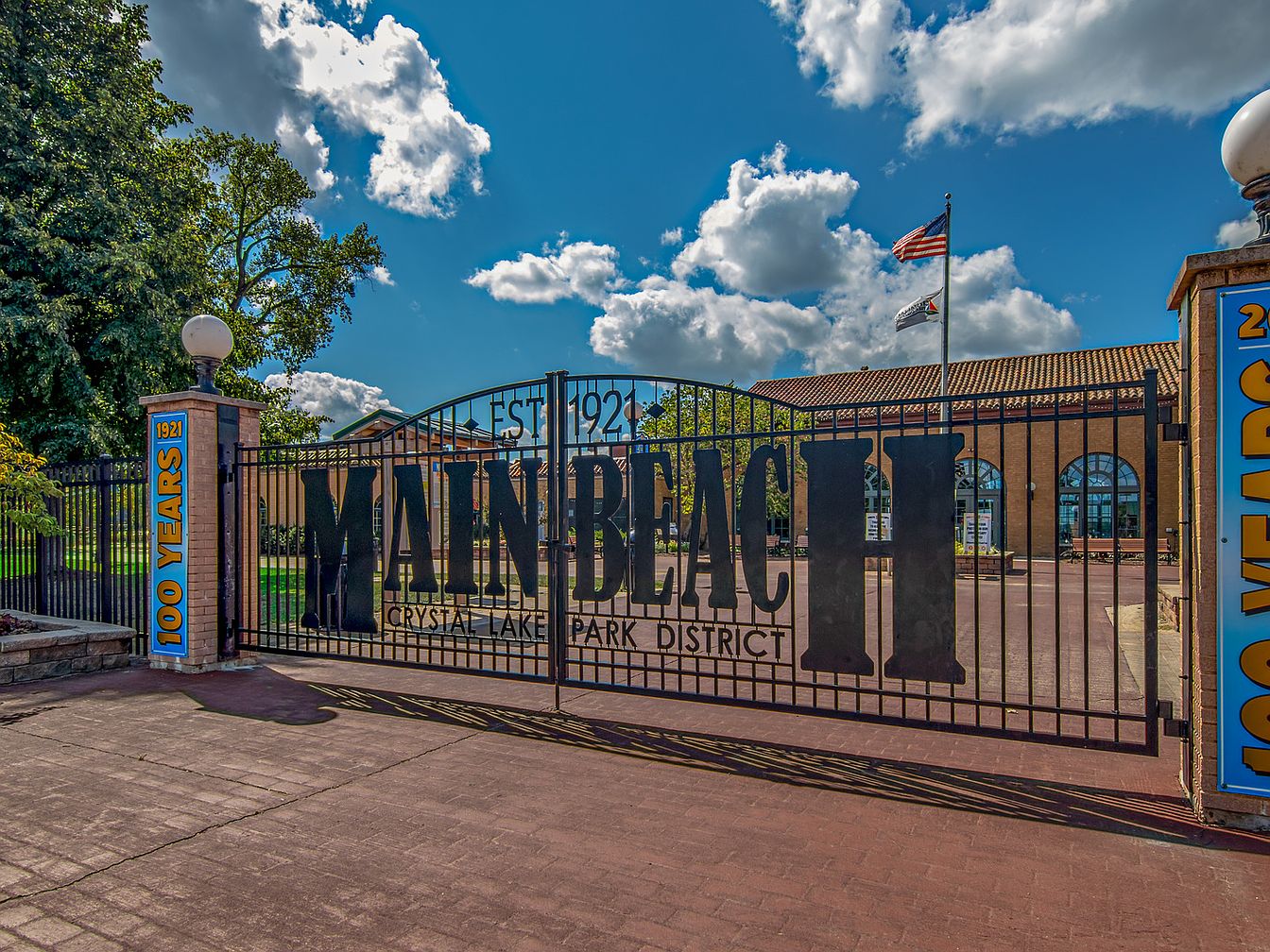 A striking iron gate, prominently displaying the name ‘MAIN BEACH,’ welcomes visitors. The gate’s design features large, bold letters against a backdrop of beautifully landscaped grounds. To the left, a historical marker notes ‘1921’ and ‘100 Years’, celebrating a century of community enjoyment. Flanking the gate are elegant lamp posts, enhancing the entrance’s charm. Behind the gate, the building boasts large arched windows, hinting at a vibrant activity space. A lush green lawn stretches under a bright blue sky dotted with fluffy white clouds, creating a refreshing and inviting atmosphere. American flags flutter gently, adding a patriotic touch.