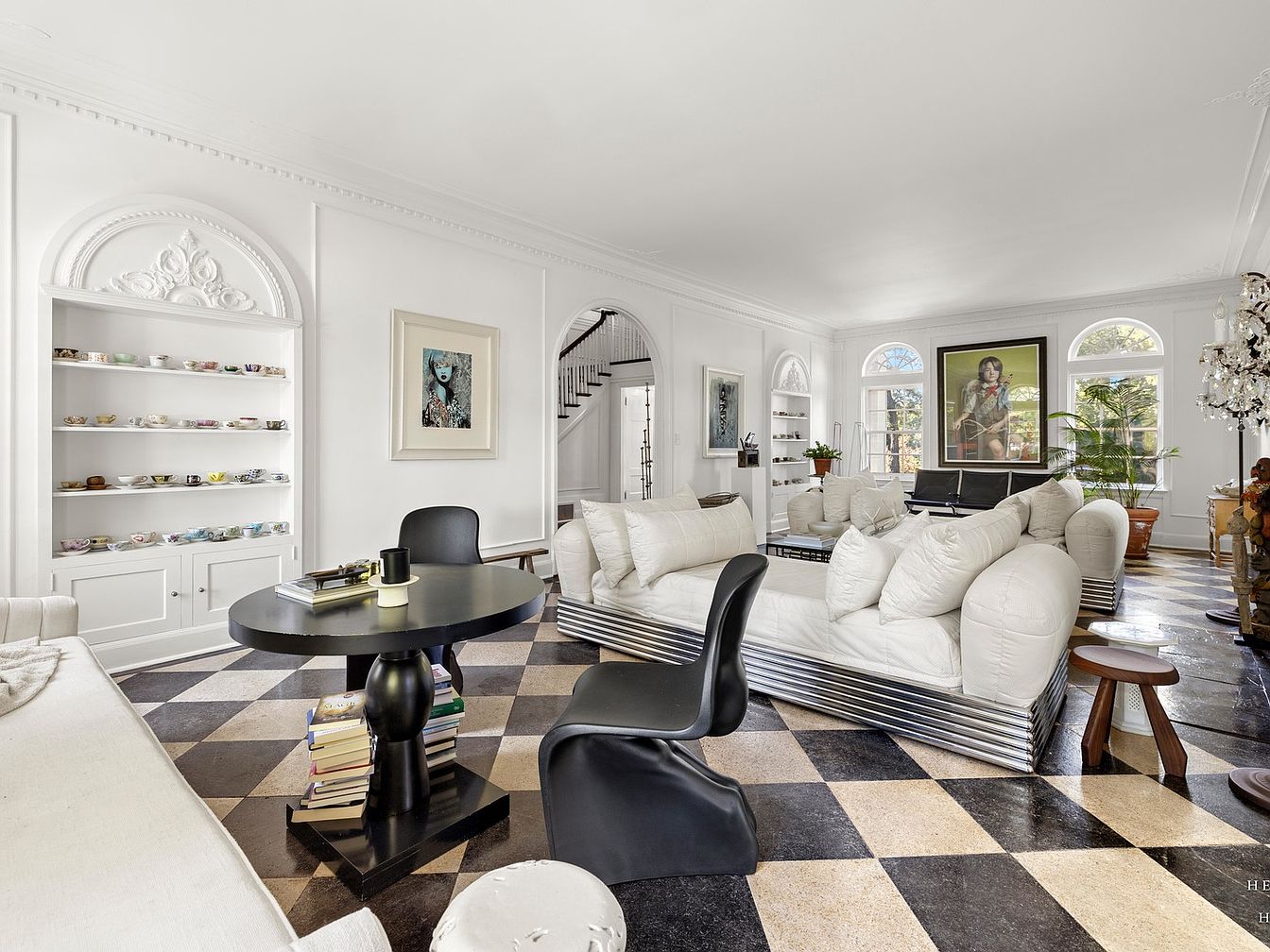 A spacious living room showcases a blend of modern and classic design elements. The room features a striking black and white checkerboard floor that adds visual interest, complemented by white walls and intricate crown molding. Plush, oversized sofas, accented with metallic details, invite relaxation. A round black table stands as a focal point, supported by stacks of books, enhancing a casual yet chic atmosphere. Stylish black chairs provide additional seating, while large windows allow abundant natural light, highlighting a prominent artwork. Decorative shelves display a curated collection of colorful bowls, adding personality to the space.