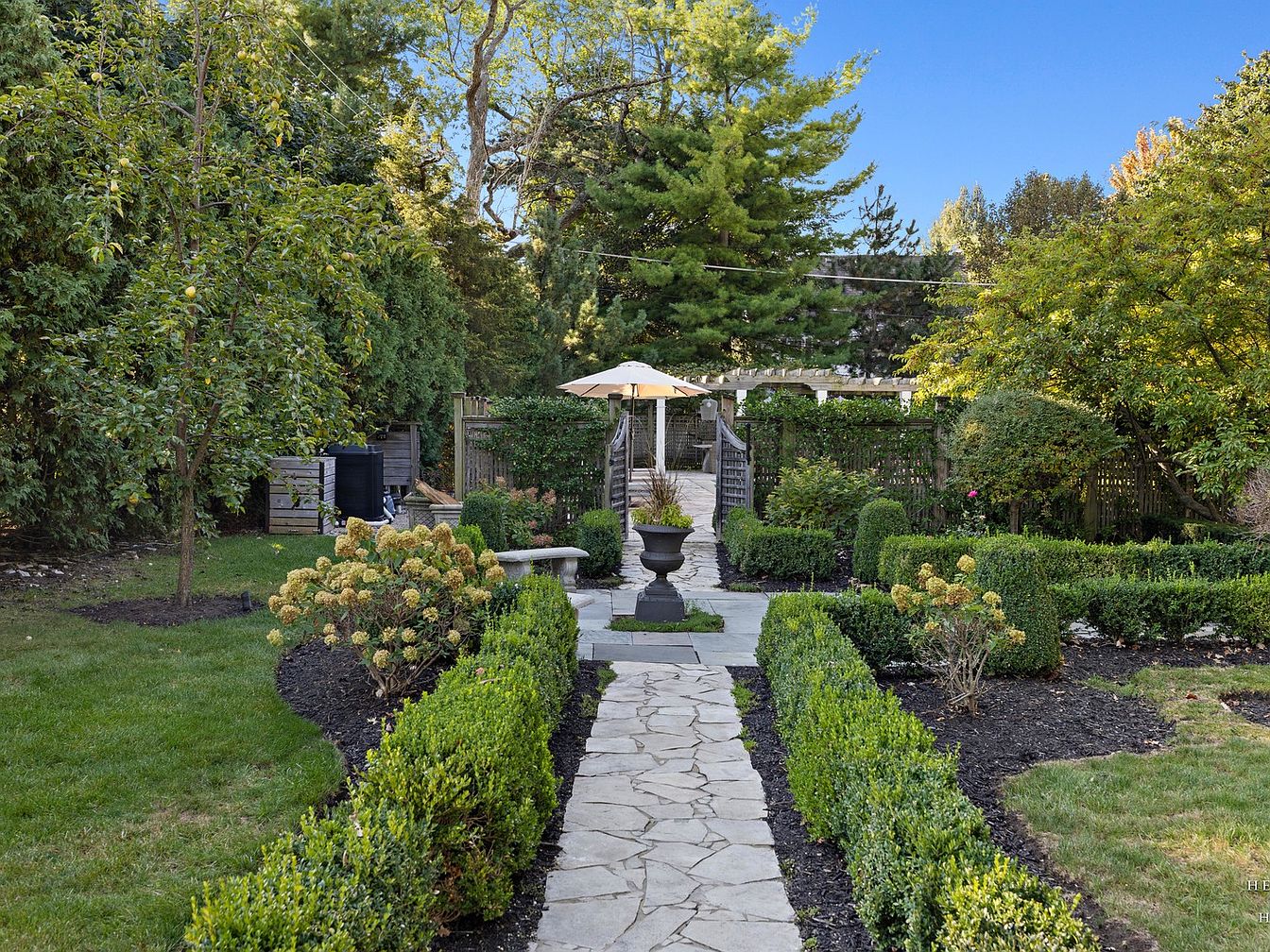 A serene garden space features a symmetrical stone pathway bordered by meticulously trimmed hedges. The pathway leads to a central ornamental urn set on a stone slab, creating a focal point. Lush greenery surrounds the area, with a mix of dense shrubs and flowering plants, displaying vibrant foliage. To one side, a fruit tree adds a rustic charm. An umbrella-covered seating area is visible at the rear, suggesting a cozy nook for relaxation. The combination of natural stone and manicured landscaping presents a harmonious blend of elegance and tranquility, ideal for outdoor gatherings or solitary enjoyment.
