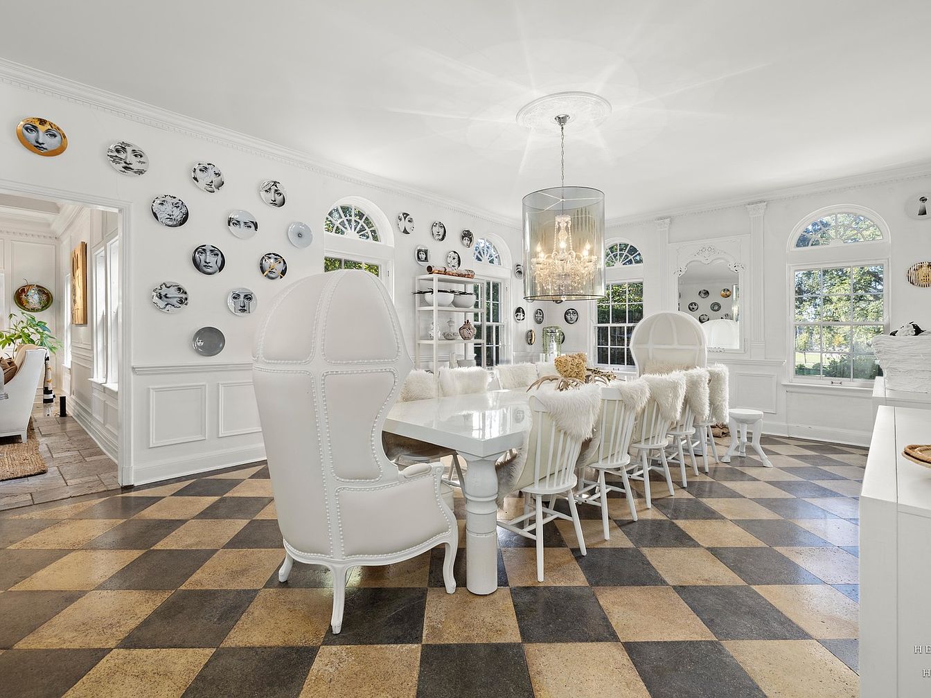 A modern dining room featuring a long, white table surrounded by uniquely designed high-back chairs adorned with plush, white faux fur. The black and beige checkered flooring adds a striking contrast to the predominantly white decor. A stunning chandelier with a cylindrical shade hangs above the table, casting a warm glow. Decorative plates in various designs are mounted on the walls, enhancing visual interest. Large windows allow natural light to fill the space, illuminating the intricate moldings and architectural details. A soft green plant and decorative items in the background introduce subtle touches of color.