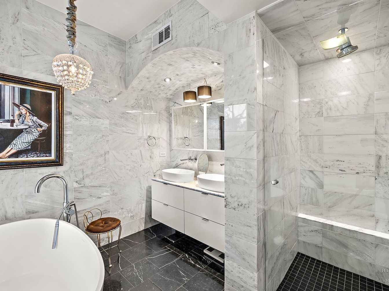 A luxurious bathroom features sleek marble walls in a light hue, adding elegance and spaciousness. The floor showcases polished black tiles that create a striking contrast. An elegant freestanding bathtub stands prominently, accompanied by a modern pull-down faucet. Across, a minimalist double vanity with clean lines holds round vessel sinks, topped with a light-colored countertop. A chic chandelier with dangling crystals offers a touch of sophistication, while recessed lighting enhances the ambiance. A large framed art piece adds character and interest to the space. The open shower area, subtly separated, continues the marble theme, creating a cohesive, opulent look.
