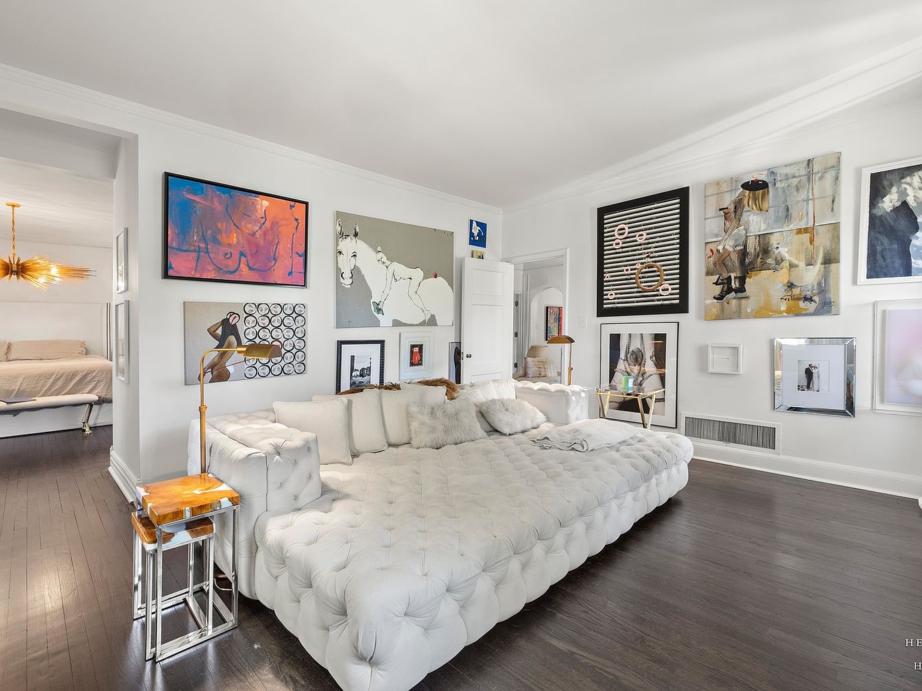 This spacious living room features a unique layout with a prominent white tufted sectional sofa, creating a focal point against dark hardwood floors. The walls are adorned with eclectic artwork, ranging from colorful abstracts to refined portraits, showcasing a modern and artistic vibe. A minimalist metallic side table complements the sofa, adding a touch of elegance. Natural light floods in, highlighting the white ceiling and subtle crown molding. An open doorway leads to a softly lit bedroom, enhancing the room’s airy feel. Warmth is introduced through the gold-toned light fixture, contributing to a cozy, inviting atmosphere.
