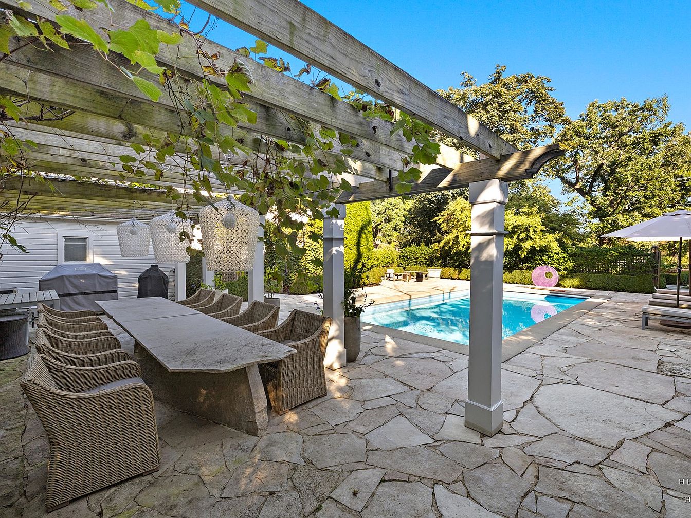 The outdoor patio features a spacious stone floor arrangement, combining natural elegance with practicality. A long, weathered dining table made of stone is surrounded by several woven wicker chairs, creating a comfortable dining atmosphere. Above, rustic wooden beams support hanging light fixtures with intricate designs, providing an inviting glow. The space is lined with lush greenery and trees, integrating nature into the design. Adjacent to the table, a sparkling blue pool reflects the clear sky, enhancing the tranquil vibe of the area. A large umbrella shelters another seating arrangement, offering a perfect retreat from the sun.