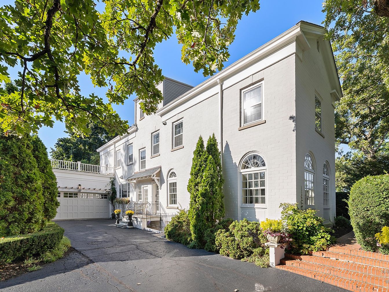 A stately historic home features a grand facade with elegant white stucco and classic architectural elements. Symmetrical window arrangements and tall, arched doorways create a sense of balance. The entrance is flanked by two slender columns, enhancing the property’s sophistication. A manicured front lawn leads to a stone pathway which is bordered by lush green hedges and decorative flowers, drawing attention to a central fountain. Rich green trees provide shade, creating a serene ambiance. The contrast between the vibrant garden and the home’s neutral palette highlights the meticulous landscaping, emphasizing a harmonious blend of nature and architecture.