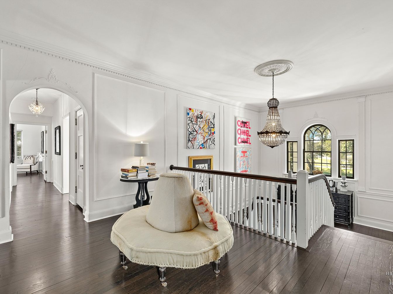 The entry hall features a spacious layout with polished dark hardwood floors that contrast elegantly against the crisp white walls. Decorative moldings and trim accentuate the architectural richness, while an ornate chandelier hangs overhead, enhancing the ambience. An eye-catching abstract artwork adds a pop of color against the minimalist backdrop. A unique, plush rounded chair sits near the staircase, providing a cozy spot. Nearby, a small black table displays stacked books and a lamp, inviting guests to linger. Arched doorways lead to other rooms, enhancing the flow and openness of this inviting entryway.