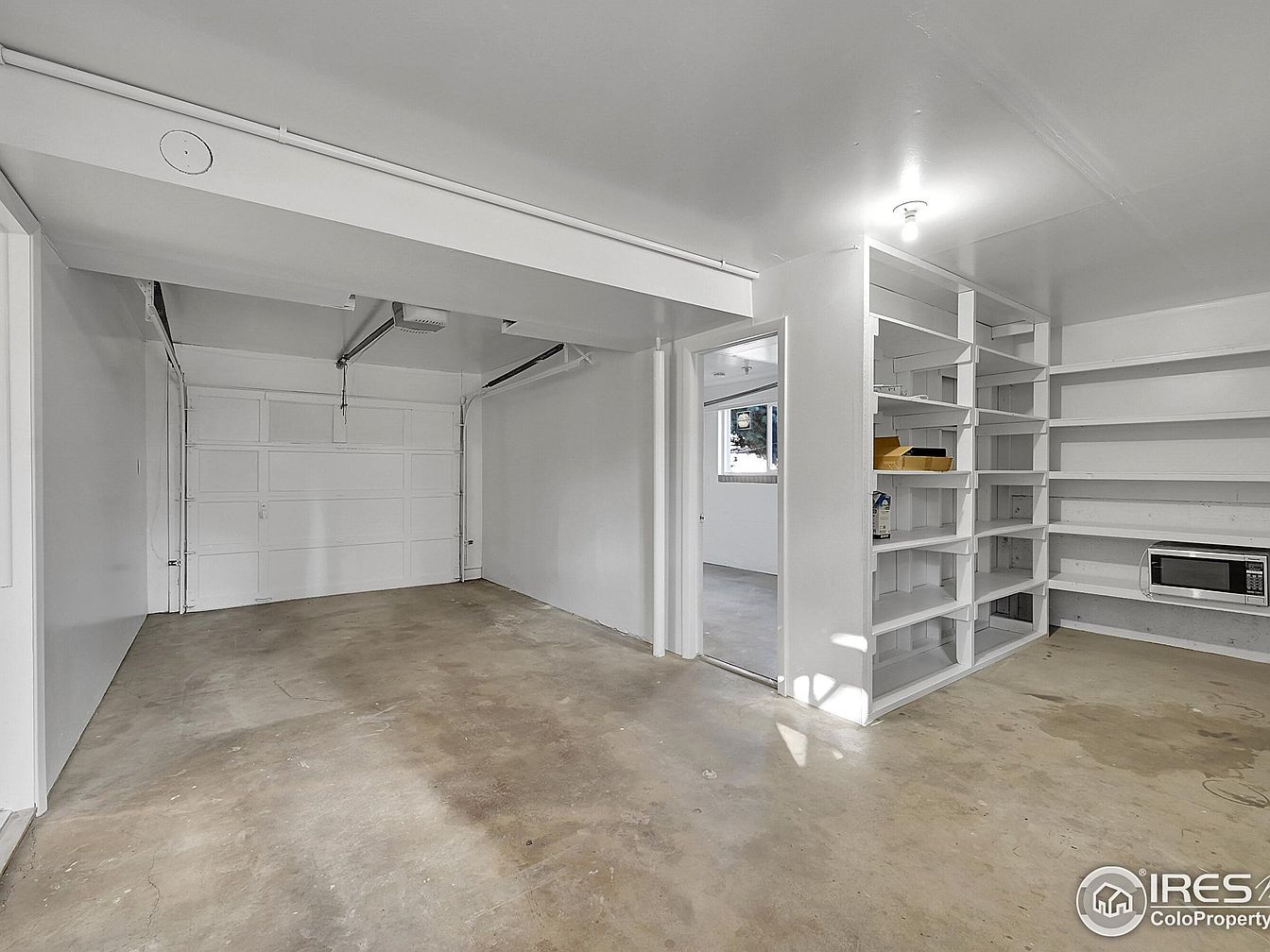 This spacious garage features a minimalistic design with pristine white walls that create a bright atmosphere. The concrete floor, slightly textured, complements the clean aesthetic. On the left, a large sectional garage door allows vehicular access, while overhead lighting illuminates the area effectively. To the right, built-in shelving provides ample storage, enhancing organization with its simple, streamlined look. A door leads to another space, promoting accessibility within the layout. The overall ambiance is functional yet uncluttered, making it suitable for various uses beyond car storage, like a workshop or additional storage space.