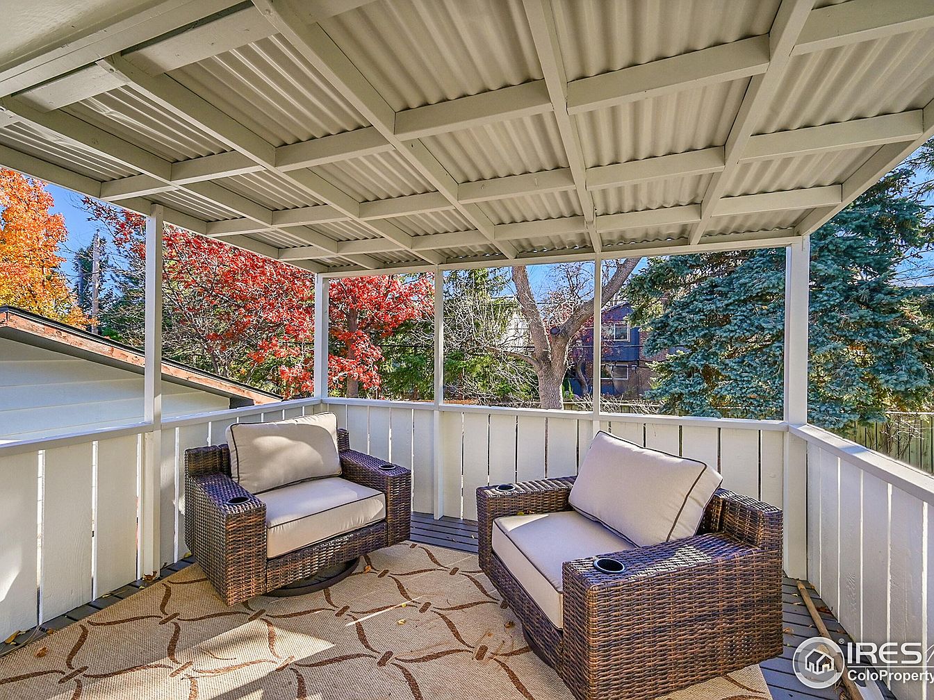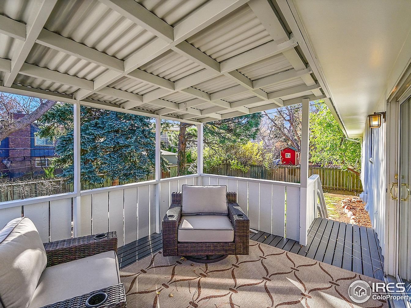 This space features an inviting covered patio with a gracefully sloped ceiling and a durable metal roofing style. The flooring showcases dark wooden planks accented by a decorative area rug with a subtle leaf pattern. Comfortable, plush seating in neutral tones of beige invites relaxation, complemented by stylish wicker armchairs. Large windows allow natural light to filter through, illuminating the area. Lush greenery and a vibrant red storage shed are visible beyond the railings, enhancing the serenity of the setting. Architectural elements, such as the white balustrade and supportive posts, contribute to the open, airy feel of this outdoor retreat.