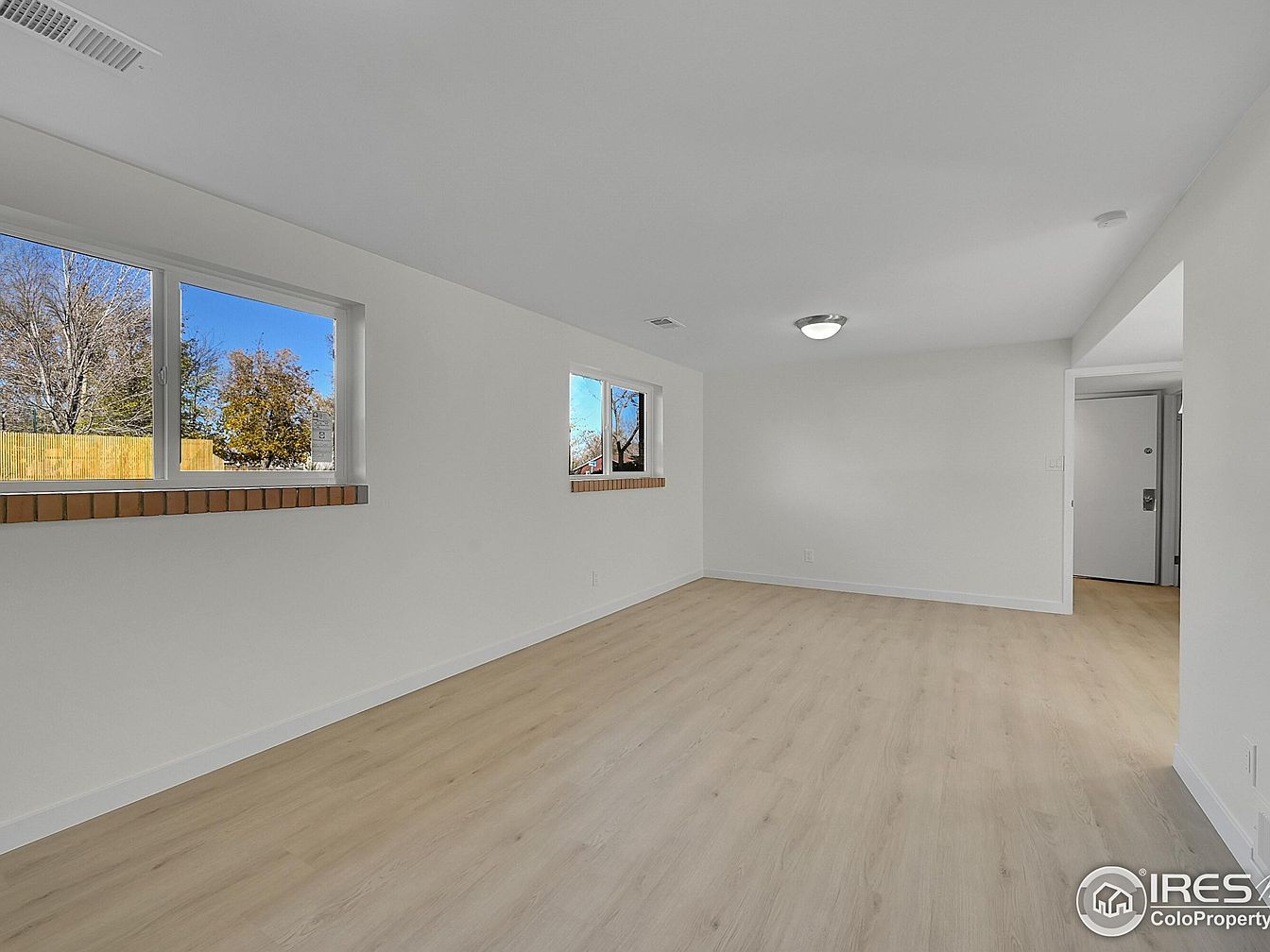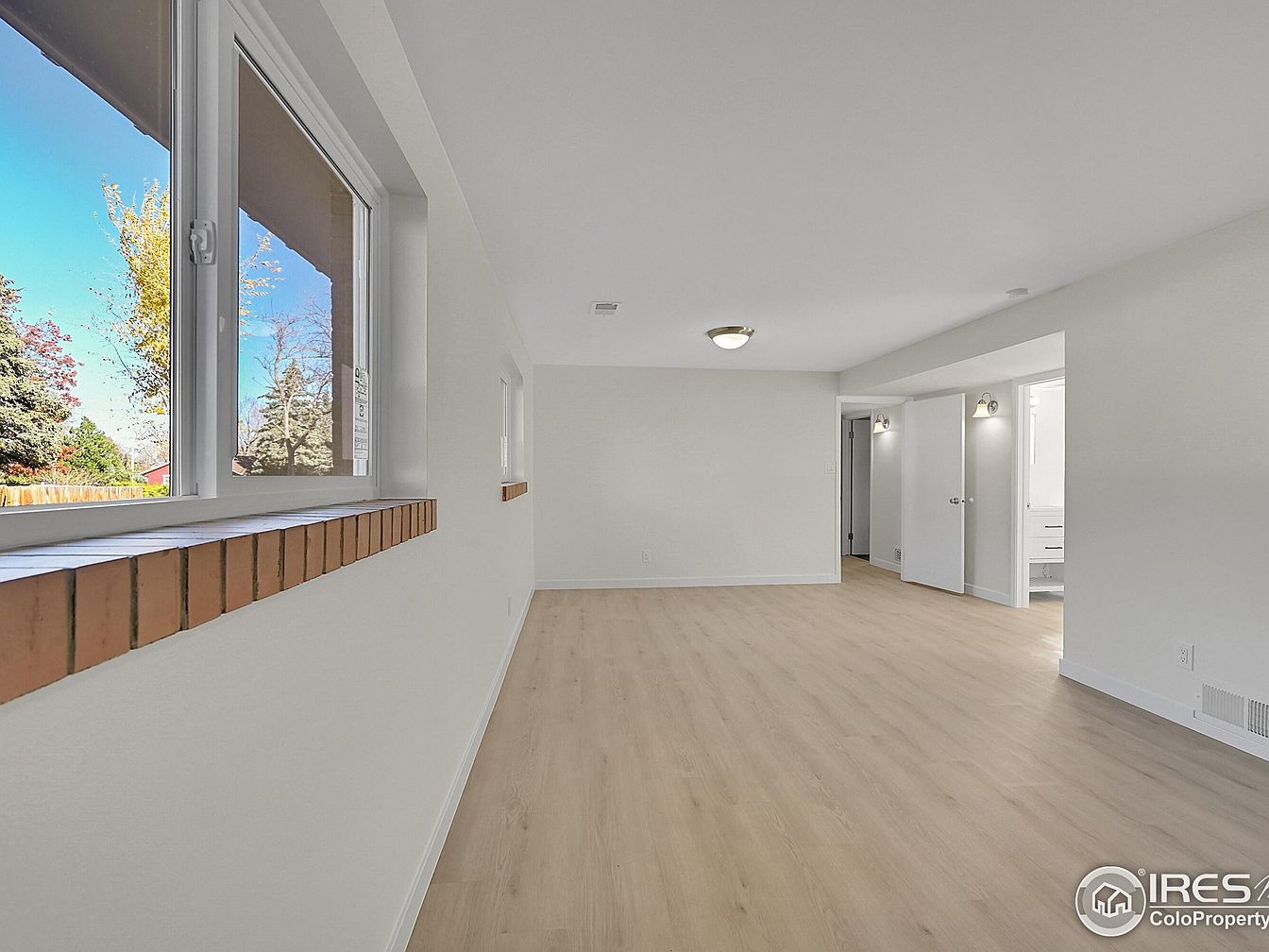 A spacious living room features light, neutral walls that enhance the sense of openness. Large windows allow abundant natural light, while a subtle brick accent beneath them adds a touch of warmth. The floor boasts light-colored wood-like laminate, contributing to a modern aesthetic. A ceiling light fixture provides additional illumination, ensuring the room feels bright and welcoming. The layout is minimalistic, offering flexibility for various furniture arrangements. To the right, a door leads to another space, suggesting a thoughtful flow throughout the house. Overall, the design emphasizes simplicity and elegance, ideal for relaxed living.