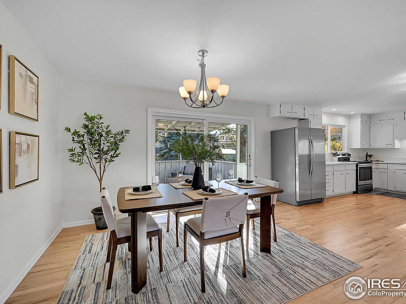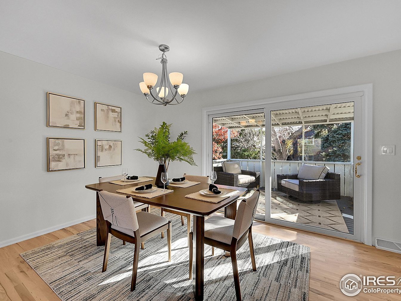 This dining area features a modern table set with a warm wood finish, complemented by upholstered chairs that enhance comfort. The floor boasts light hardwood, creating a bright and inviting atmosphere. A plush area rug with subtle patterns adds texture beneath the table. Neutral walls, accented by framed artwork, bring an elegant touch. A bold chandelier hangs overhead, providing ambient lighting. Large sliding glass doors lead to a deck area, inviting natural light and views of the outdoor greenery. The adjacent kitchen, visible in the background, showcases sleek white cabinetry and stainless steel appliances, maintaining a cohesive aesthetic.