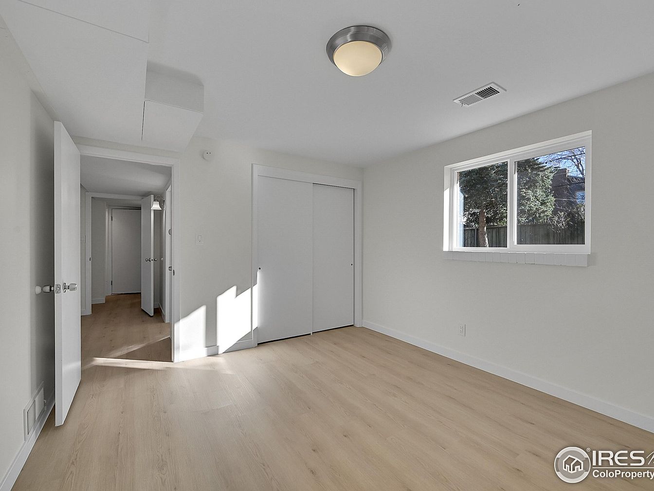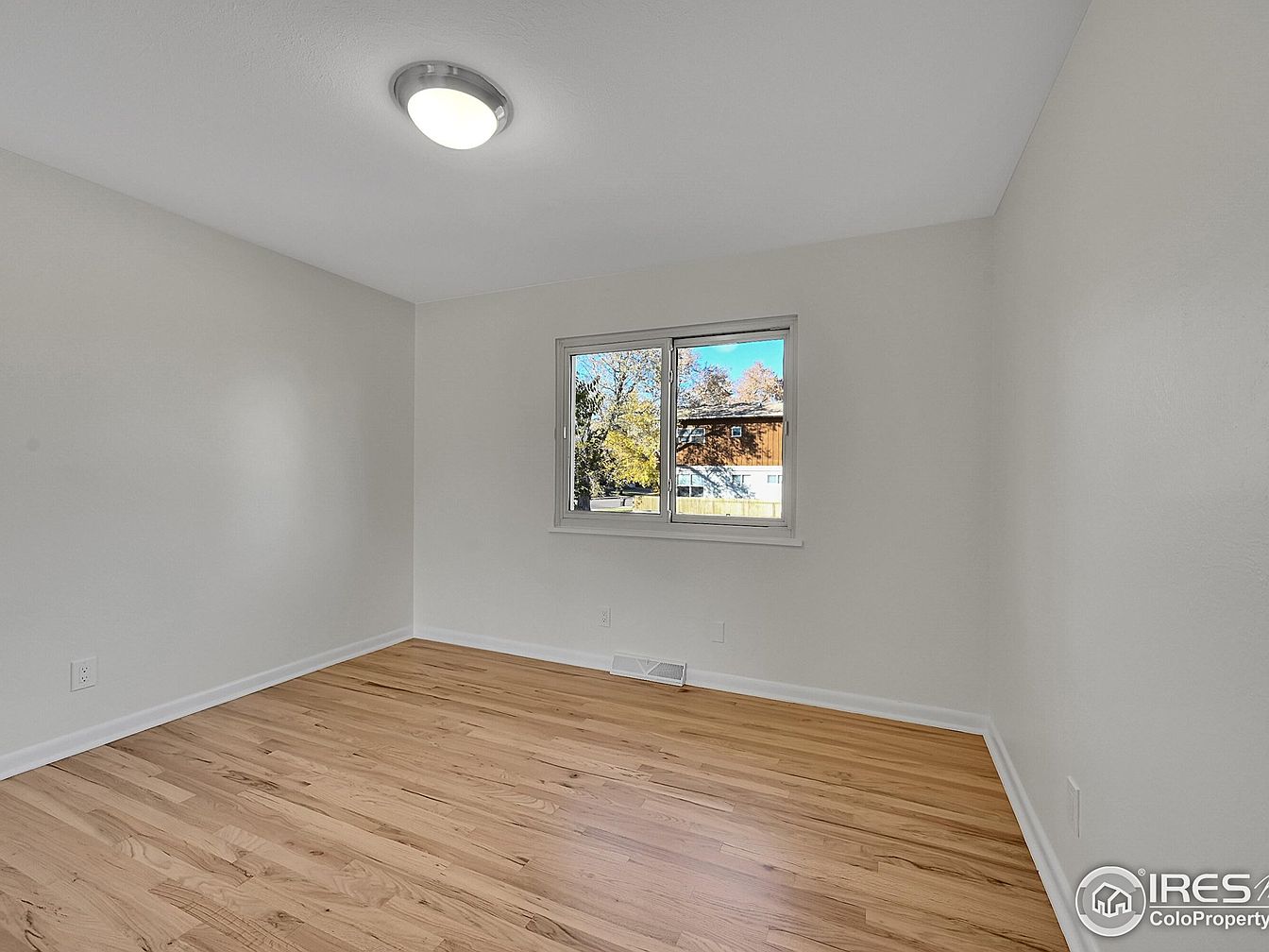 This space showcases a minimalist bedroom with a clean, uncluttered aesthetic. Light beige walls enhance the sense of openness, while the natural light floods in through a modern window, highlighting the beautiful, warm-toned hardwood flooring. The ceiling features a simple, round light fixture that complements the room’s simplicity. Overall, the geometry of the room is straightforward, promoting tranquility. The lack of furnishings allows for versatility, making it easy to imagine personalized decor. This bedroom exudes a welcoming ambiance, ideal for relaxation or rest.