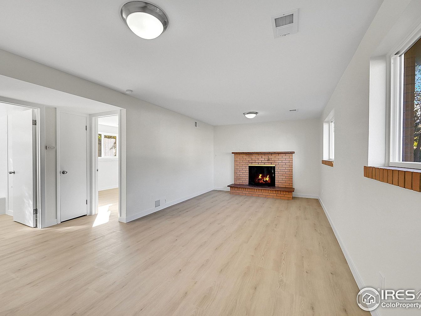 This spacious living room features a modern yet cozy design. The warm, light wood flooring complements the neutral white walls, creating an airy atmosphere. A centrally located brick fireplace serves as a focal point, framed by a simple wooden mantel that adds to the room’s charm. Large windows on either side allow natural light to flood in, enhancing the warmth of the space. Two doors lead to adjoining rooms, seamlessly connecting this area to the rest of the home. The ceiling is adorned with a sleek, flush-mounted light fixture, ensuring adequate illumination throughout.